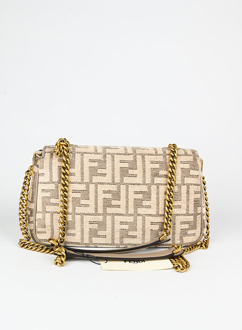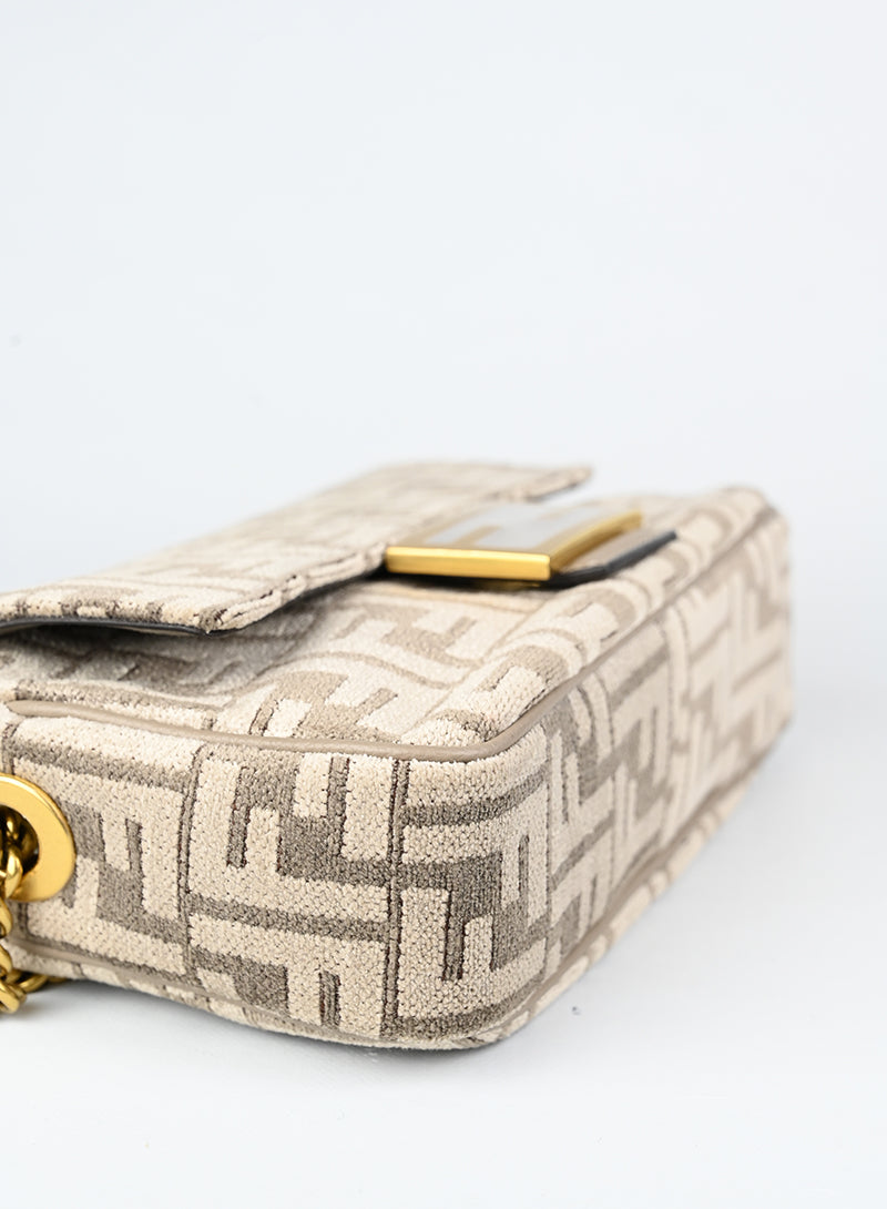 Elegante borsa a tracolla Fendi Baguette in velluto, caratterizzata da una raffinata combinazione di tonalità sabbia e panna. La tracolla con catena in oro brunito e inserto in pelle garantisce comfort e stile. Chiusura con patta FF in metallo dorato brunito. L'interno, rivestito in suede greige, ospita uno scompartimento principale e una pratica taschina con zip. Un accessorio senza tempo che incarna il lusso e la sofisticatezza del marchio italiano.