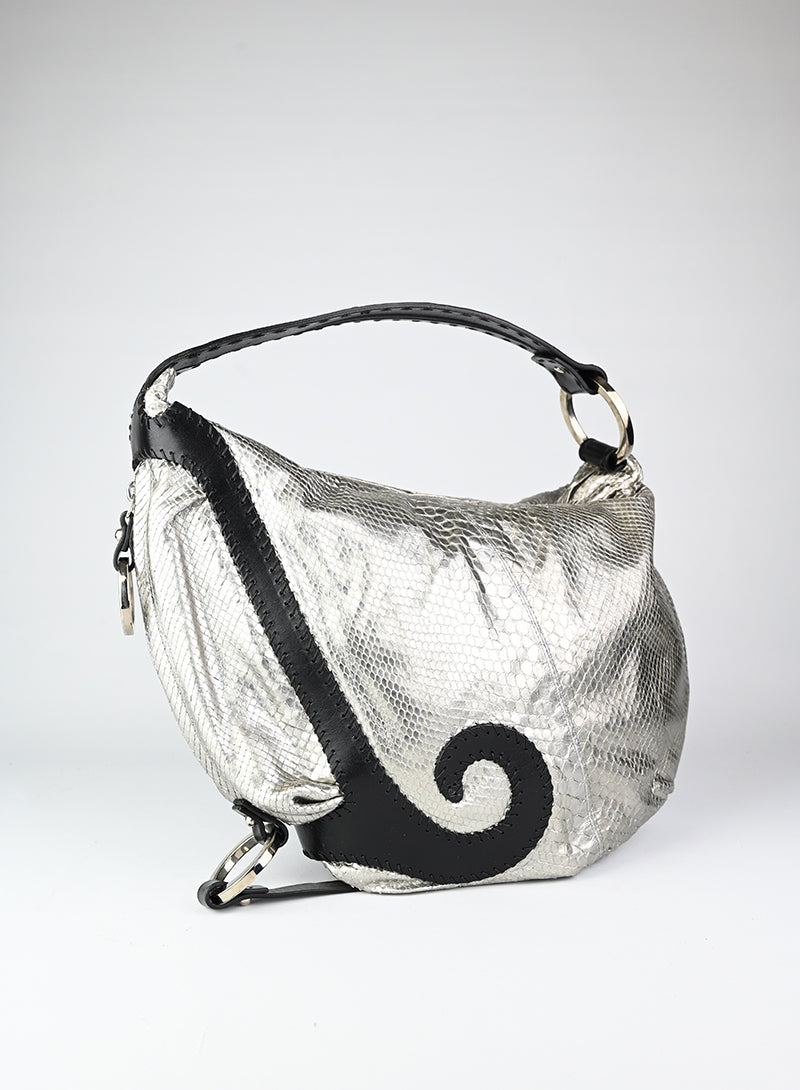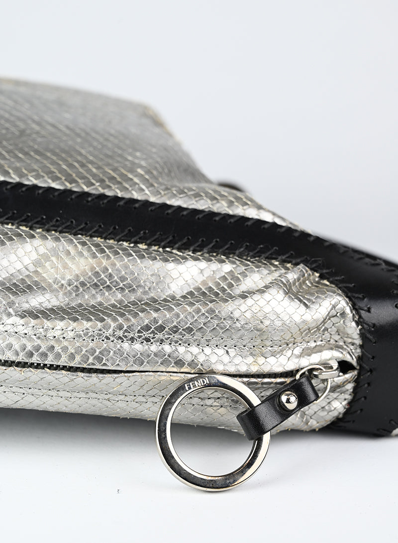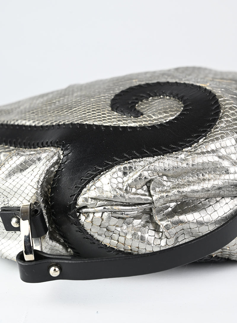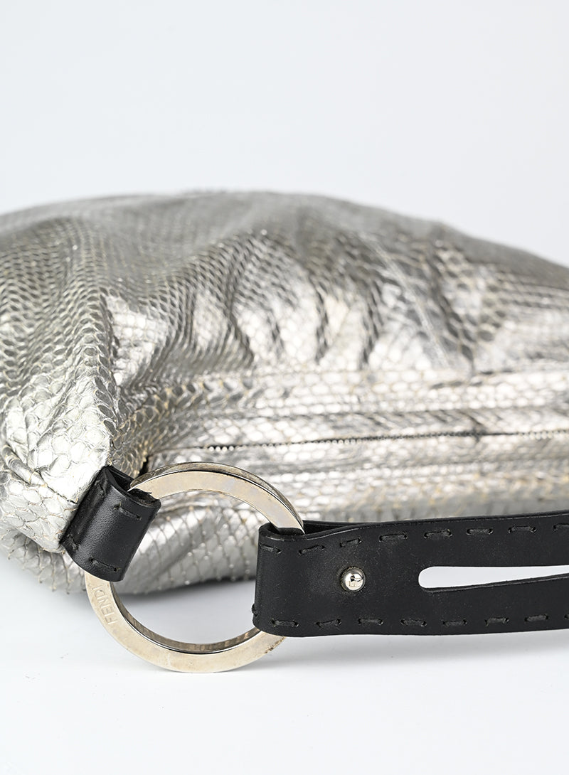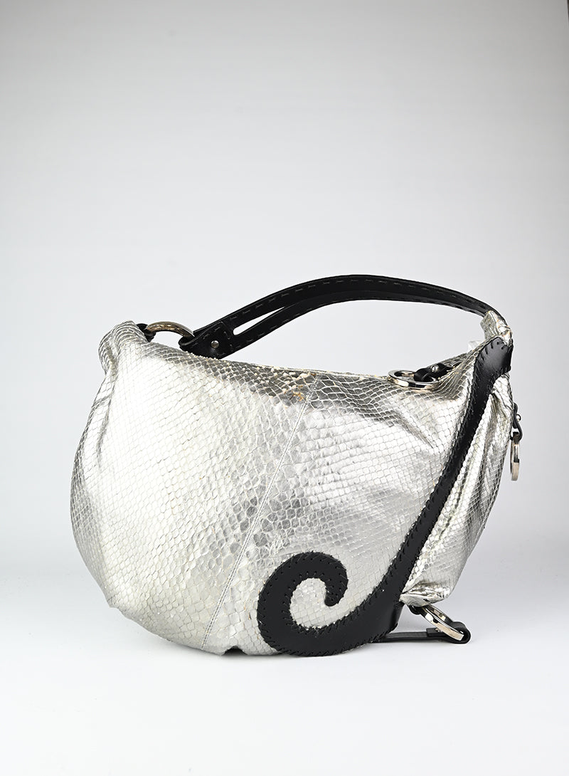 Esalta il tuo stile sofisticato con la Borsa Fendi in pelle argento. Realizzata con una combinazione di pitone argento e inserti ghirigori in pelle nera, questa borsa è dotata di un elegante manico in pelle nera con anello in metallo argentato e una comoda chiusura zip. Con il suo interno nero e una tasca zip, sarà il perfetto complemento per le tue occasioni esclusive.