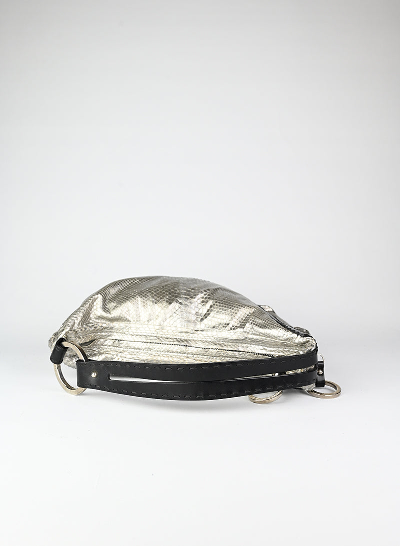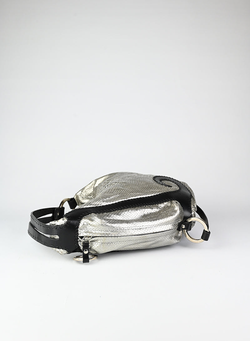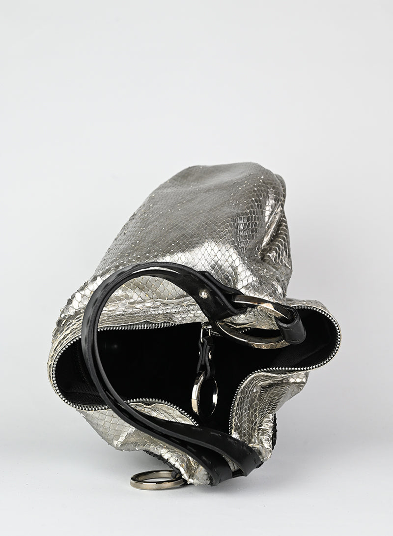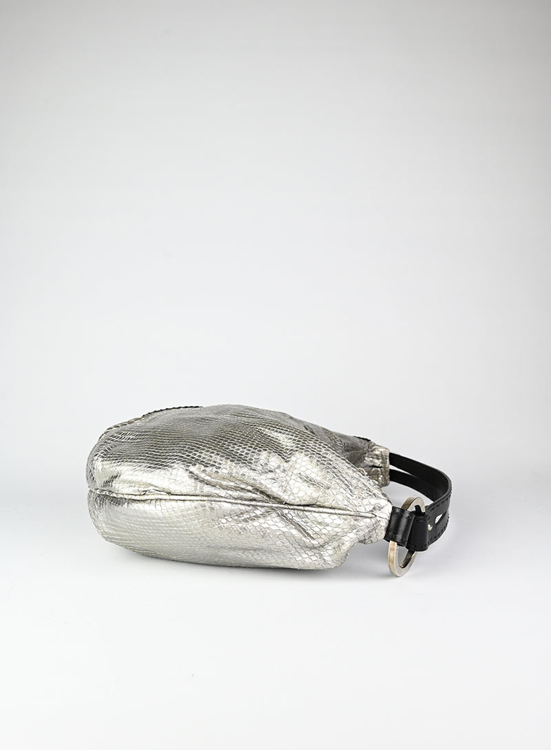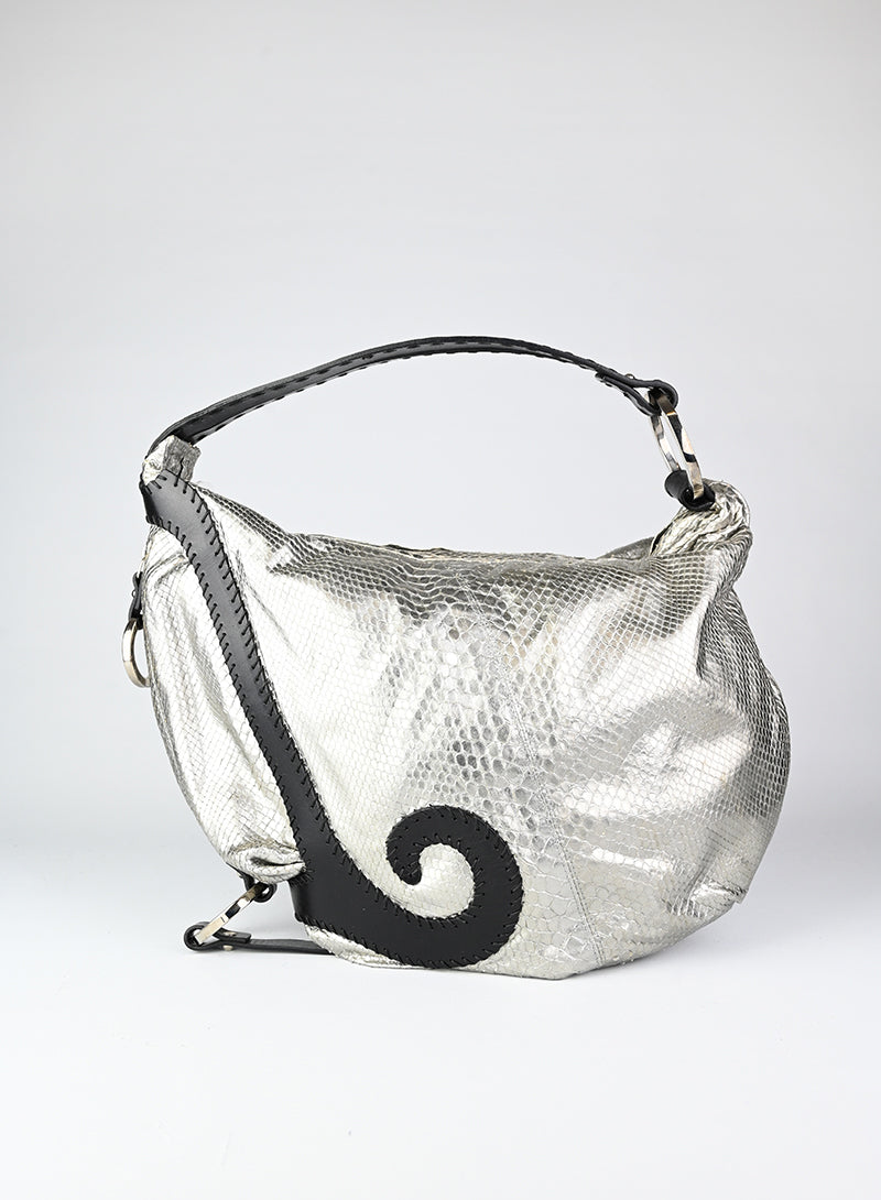 Esalta il tuo stile sofisticato con la Borsa Fendi in pelle argento. Realizzata con una combinazione di pitone argento e inserti ghirigori in pelle nera, questa borsa è dotata di un elegante manico in pelle nera con anello in metallo argentato e una comoda chiusura zip. Con il suo interno nero e una tasca zip, sarà il perfetto complemento per le tue occasioni esclusive.