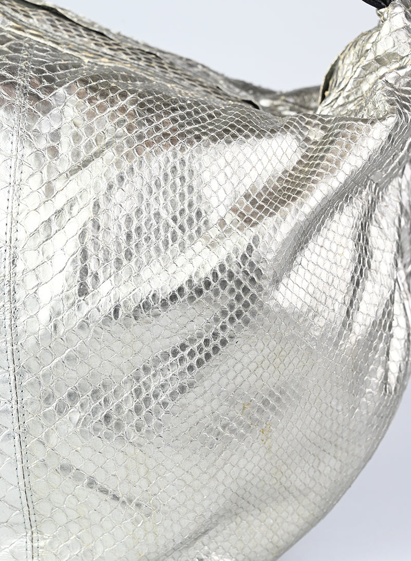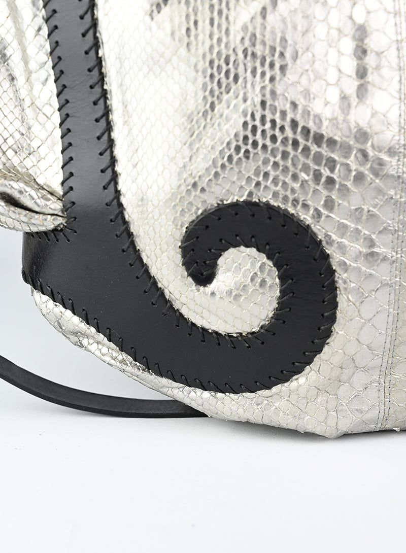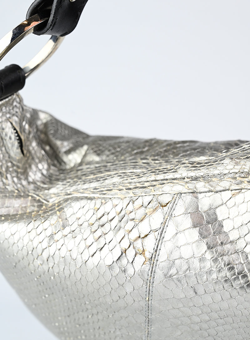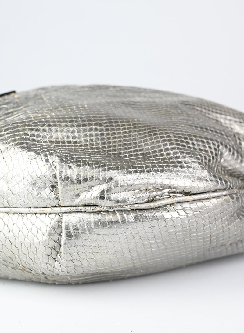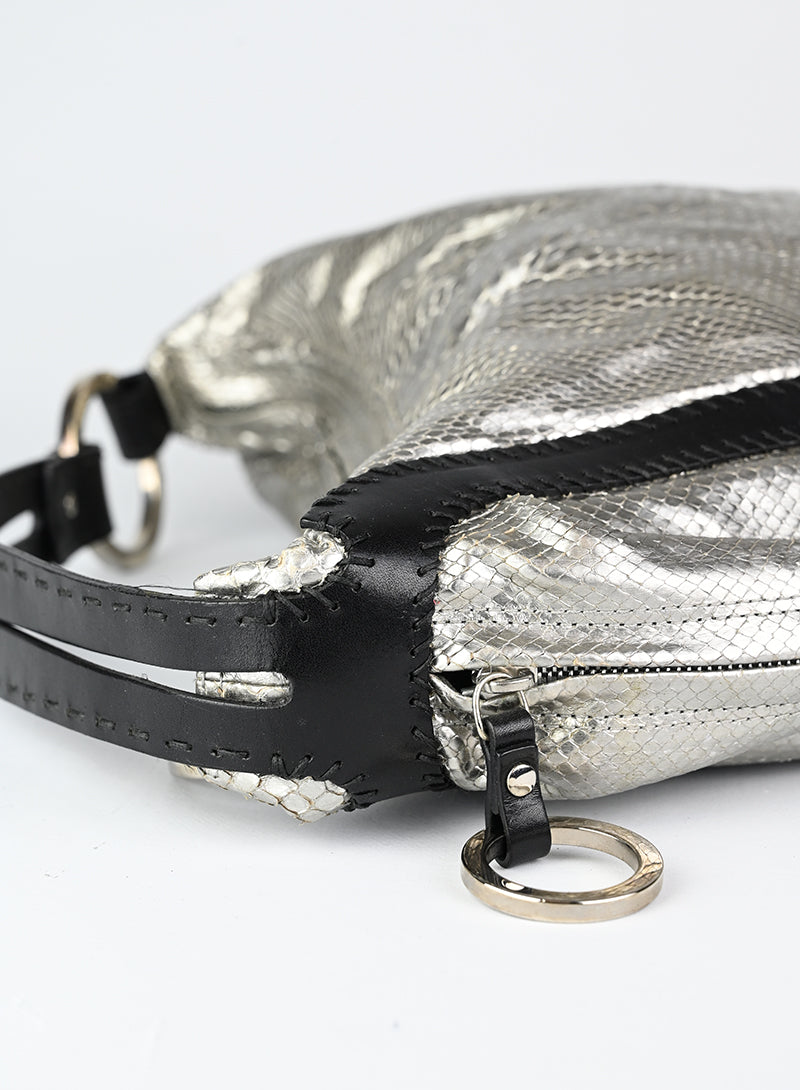 Esalta il tuo stile sofisticato con la Borsa Fendi in pelle argento. Realizzata con una combinazione di pitone argento e inserti ghirigori in pelle nera, questa borsa è dotata di un elegante manico in pelle nera con anello in metallo argentato e una comoda chiusura zip. Con il suo interno nero e una tasca zip, sarà il perfetto complemento per le tue occasioni esclusive.