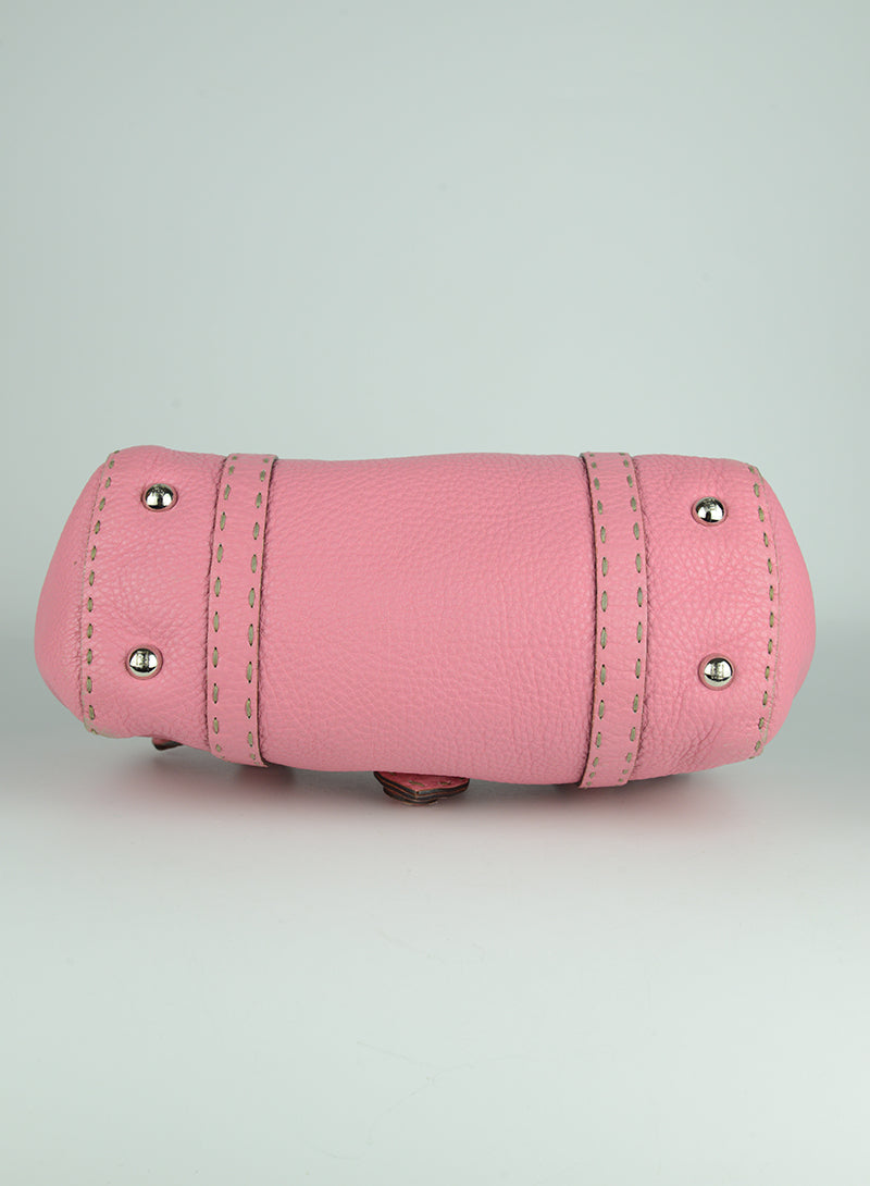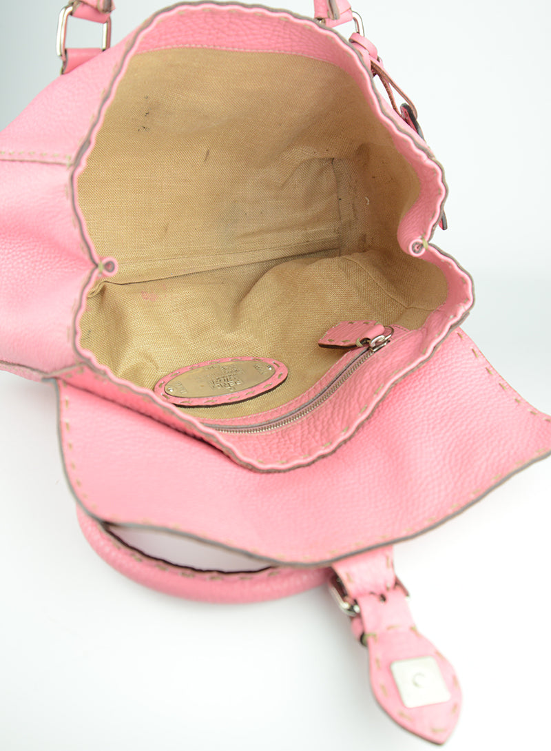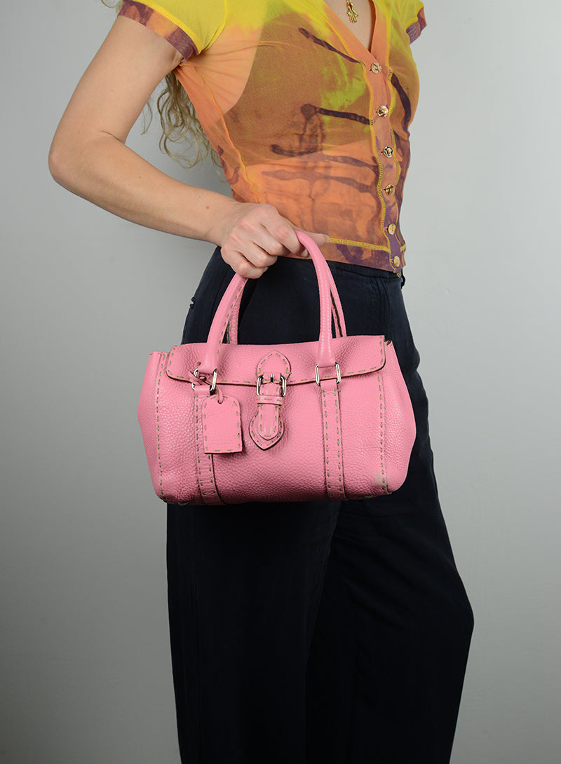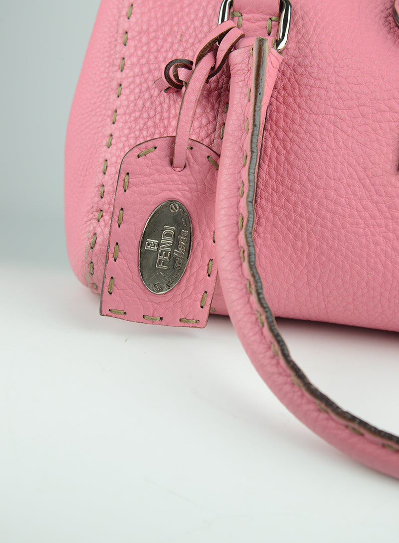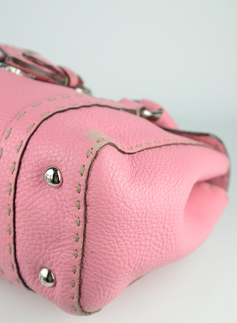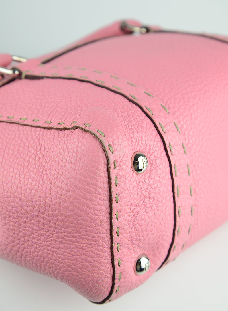 Elegante borsina Fendi Selleria in pelle rosa. Dotata di due manici per un look sofisticato, hardware argentato e impunture di alta qualità. Ampio scompartimento interno con tasca con zip per una perfetta organizzazione. Chiusura magnetica per un tocco di raffinatezza.