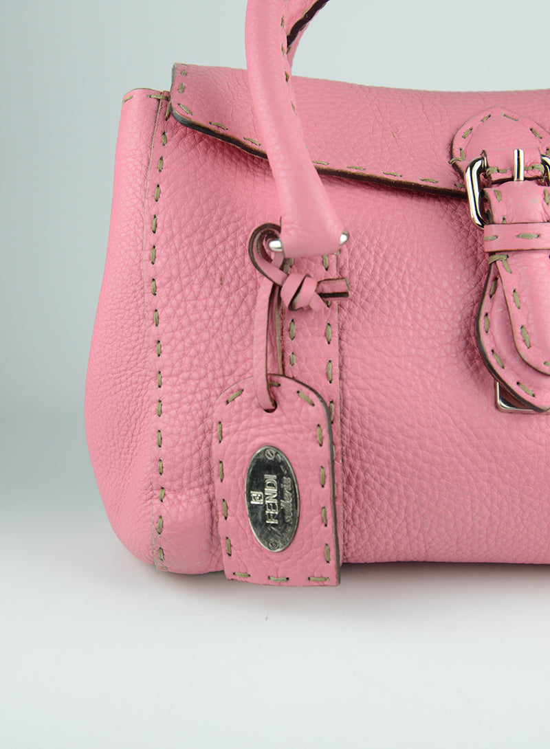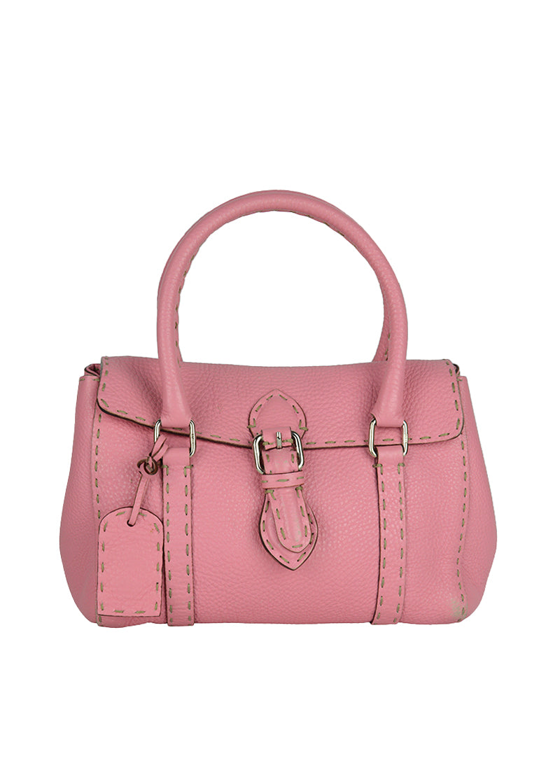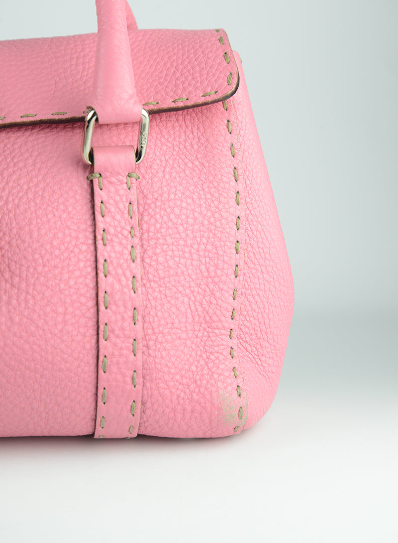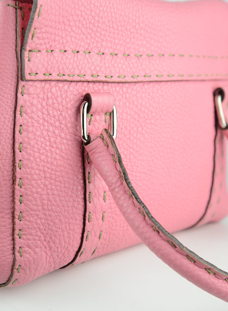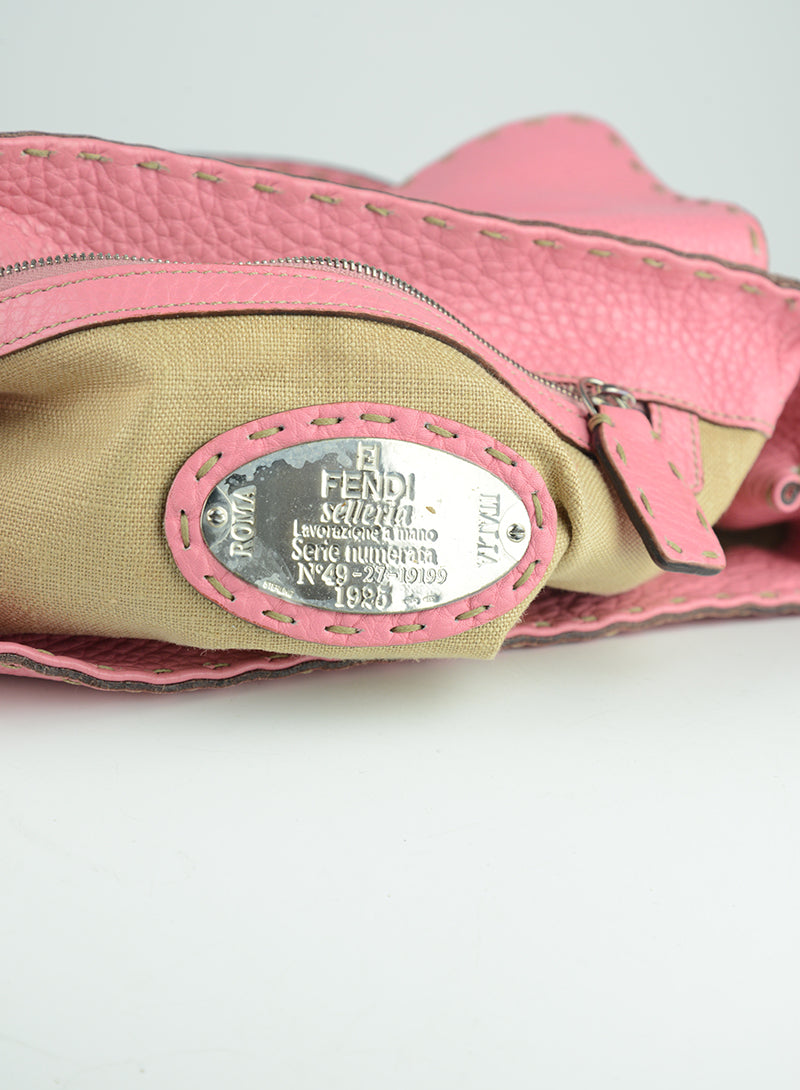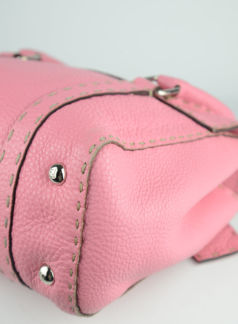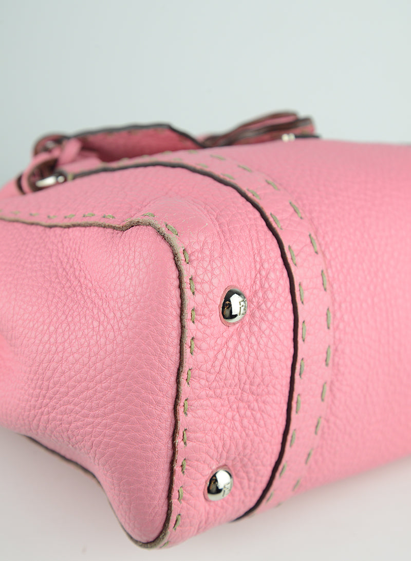 Elegante borsina Fendi Selleria in pelle rosa. Dotata di due manici per un look sofisticato, hardware argentato e impunture di alta qualità. Ampio scompartimento interno con tasca con zip per una perfetta organizzazione. Chiusura magnetica per un tocco di raffinatezza.