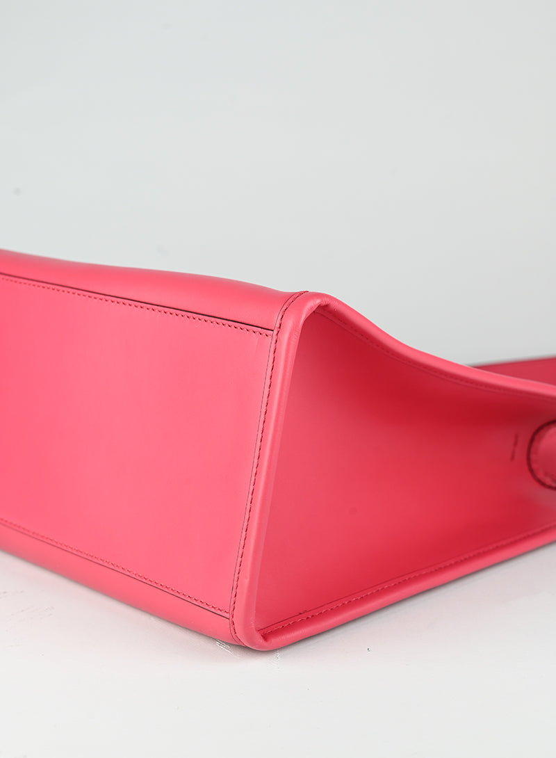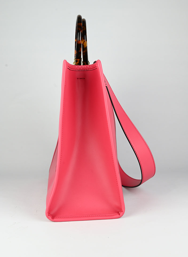 Porta con stile la tua vita quotidiana con la Fendi Shopper Sunshine in pelle rossa. La borsa è caratterizzata da un design squadrato in pelle rosso fragola, abbinato a due manici rigidi tartarugati e una sofisticata tracolla in pelle. L'hardware oro e le impunture avanti aggiungono un tocco di lusso. All'interno troverai un ampio scompartimento non foderato per riporre tutti i tuoi oggetti preziosi.