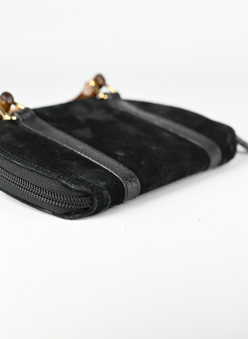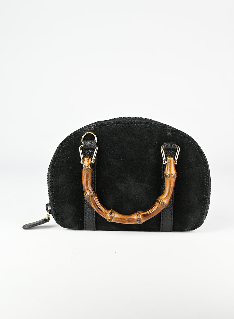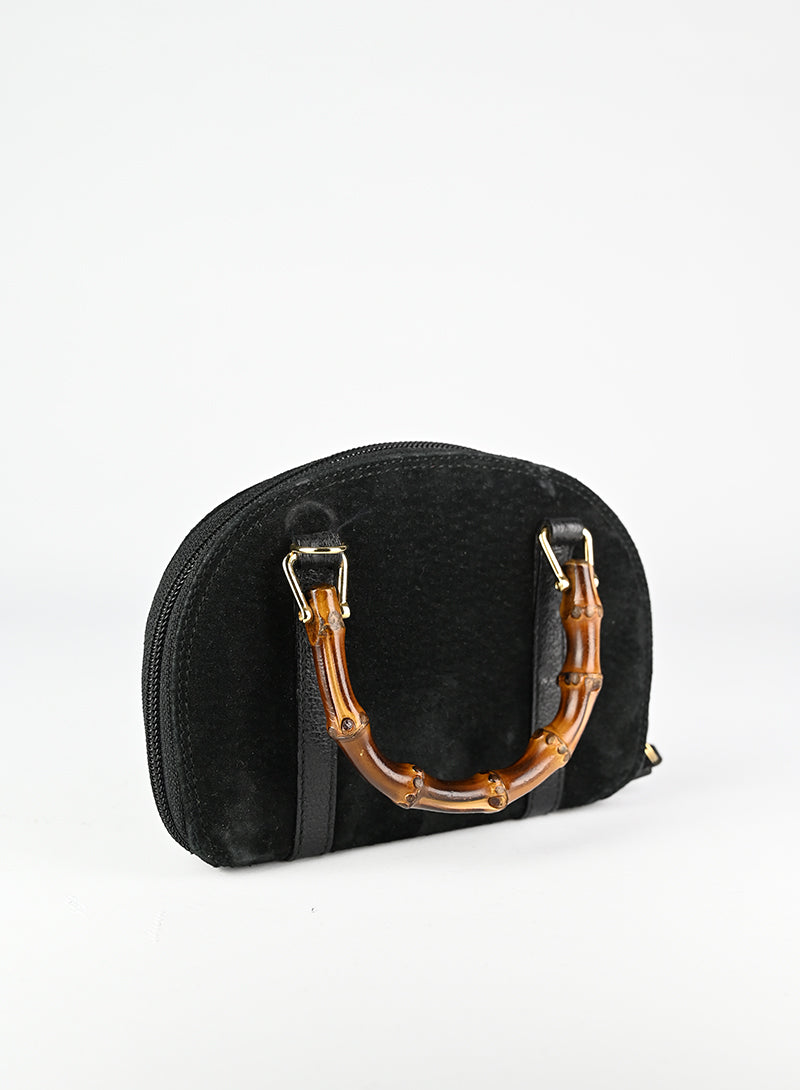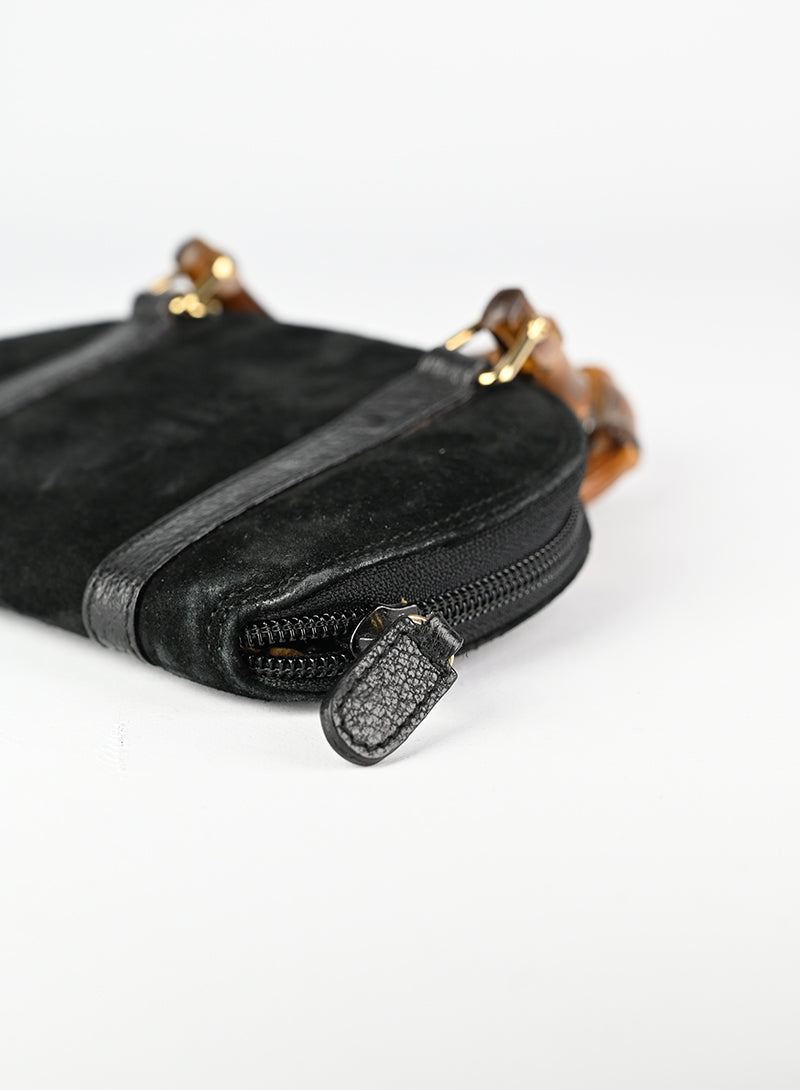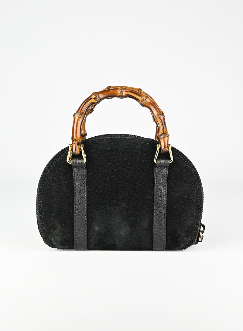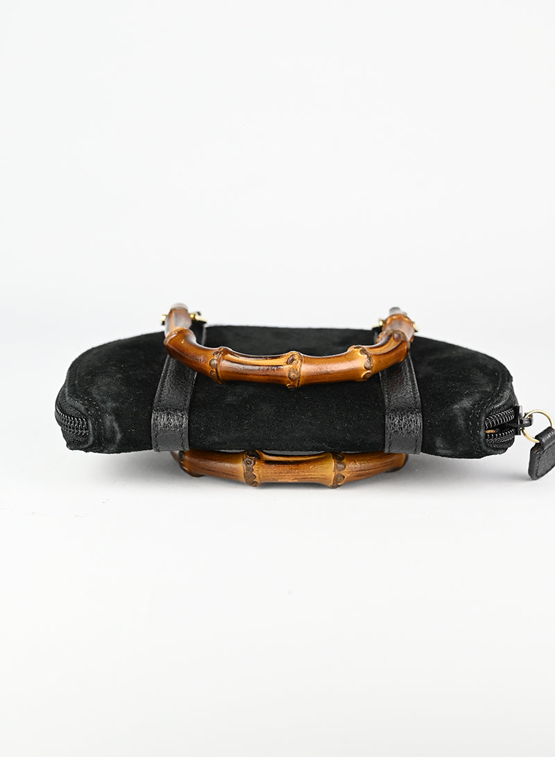 Emblema dell'eleganza e del lusso, la nuova Gucci Borsa Bamboo in suede nero è una pregiata borsina a mano in suede con dettagli hardware oro e chiusura zip. Profilata in pelle e dotata di scompartimenti interni per carte e portamonete, è perfetta per un look vintage e raffinato.