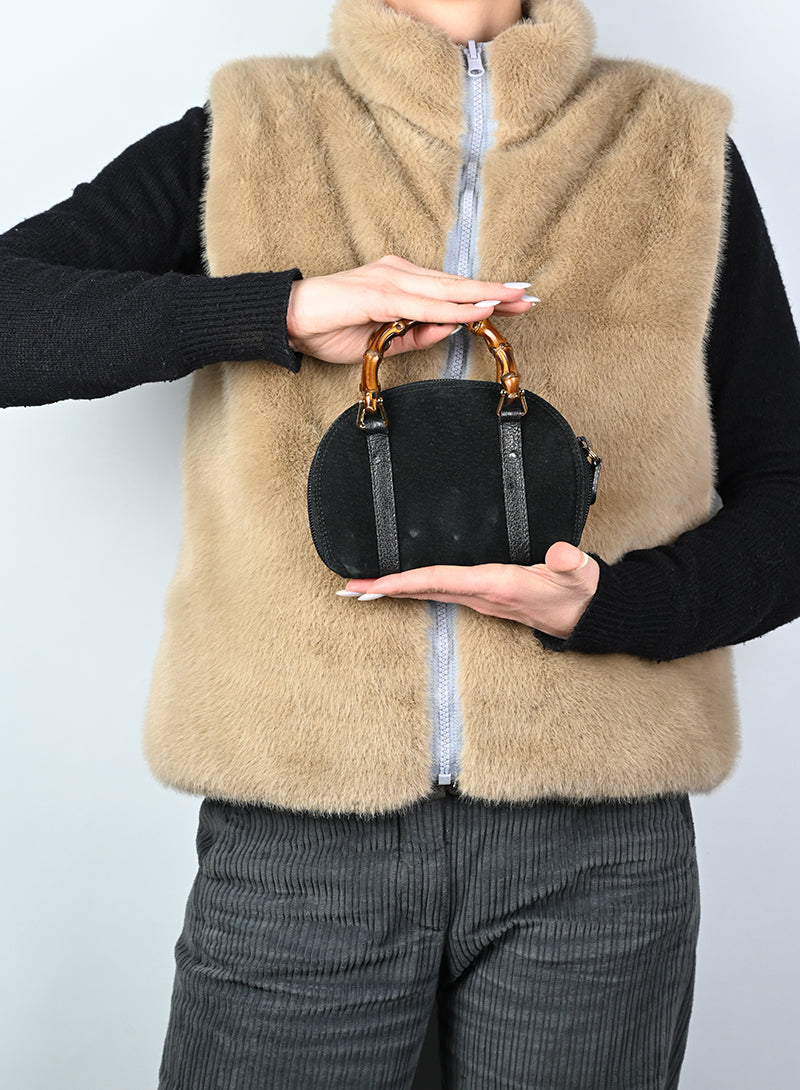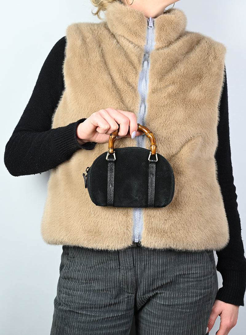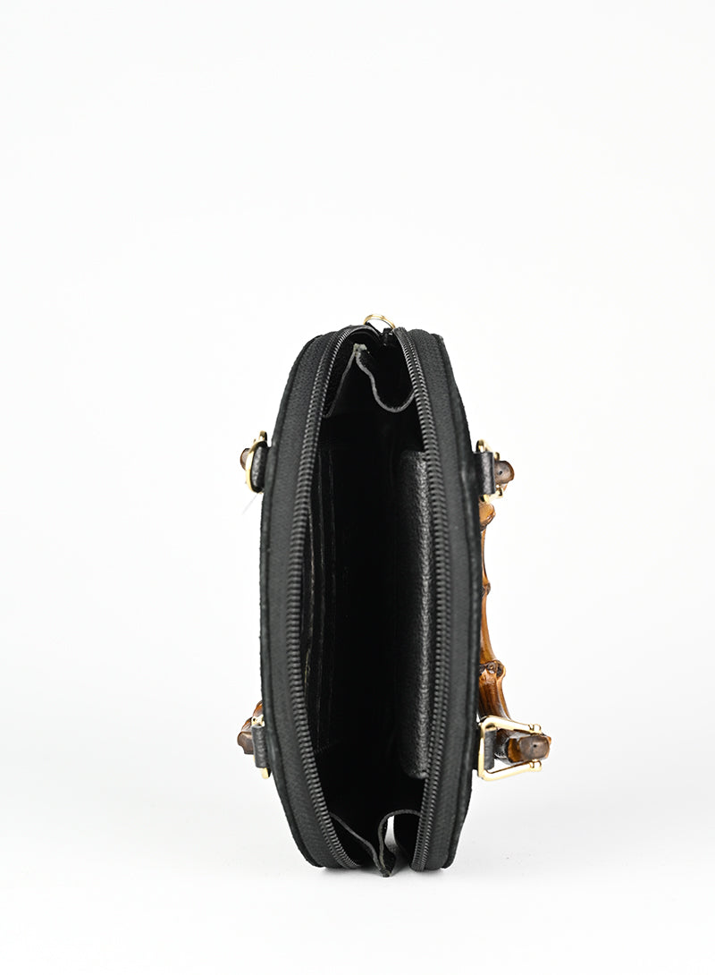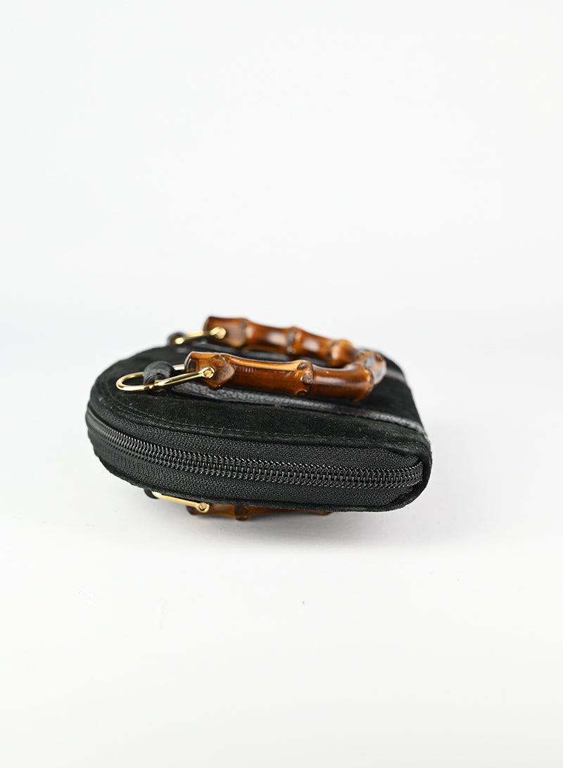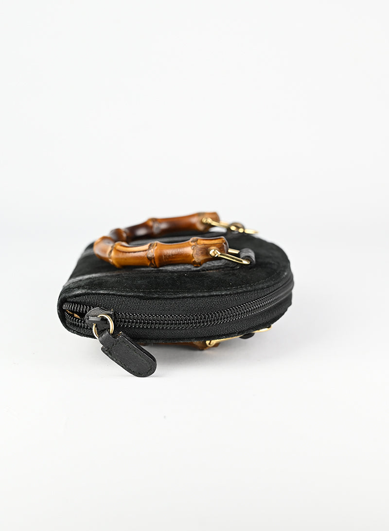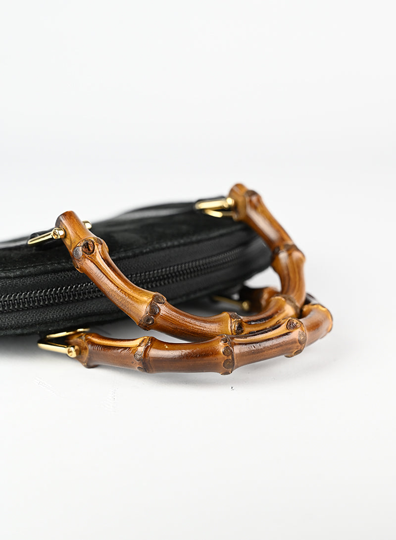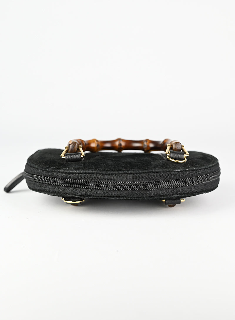 Emblema dell'eleganza e del lusso, la nuova Gucci Borsa Bamboo in suede nero è una pregiata borsina a mano in suede con dettagli hardware oro e chiusura zip. Profilata in pelle e dotata di scompartimenti interni per carte e portamonete, è perfetta per un look vintage e raffinato.