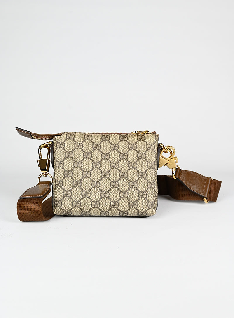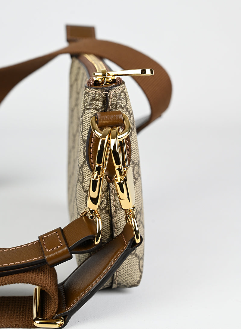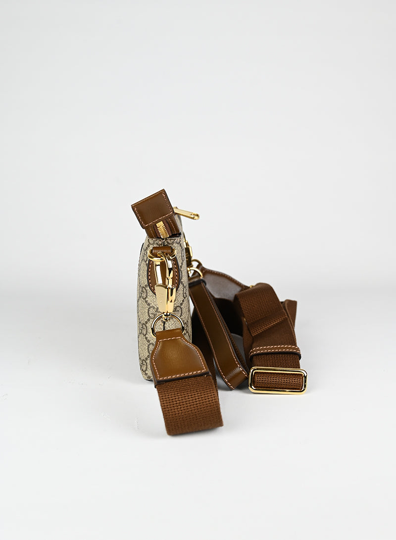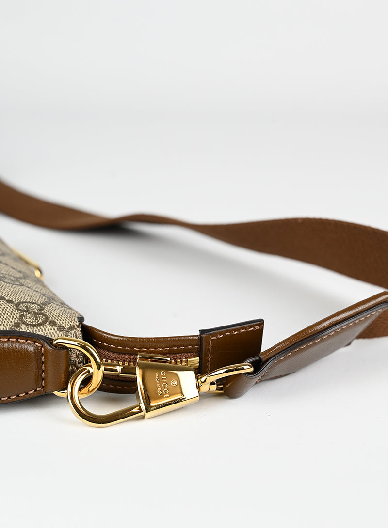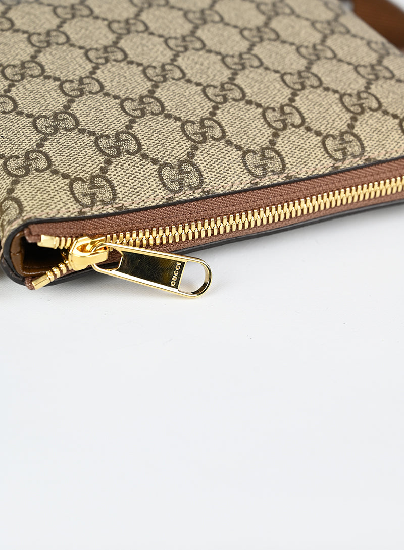Esclusiva borsa a tracolla Gucci beige in pelle con monogramma GG e tracolla regolabile in tessuto nocciola. Completa di laccio da polso in pelle e chiusura zip oro. Dettagliati profili in pelle marrone e spazioso scomparto interno in canvas ecrù. Un'opera d'arte da portare sempre con sé.