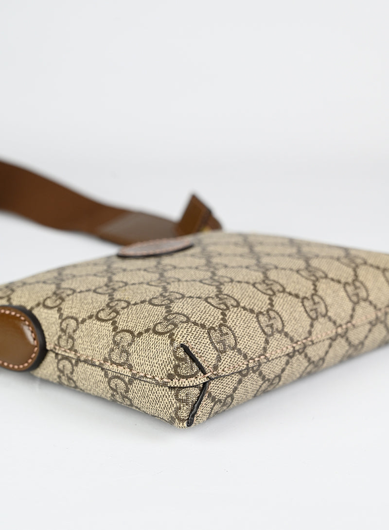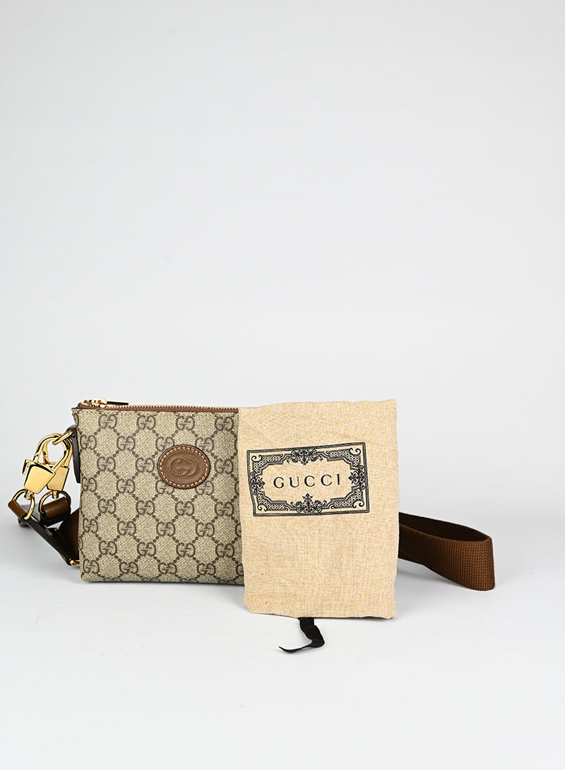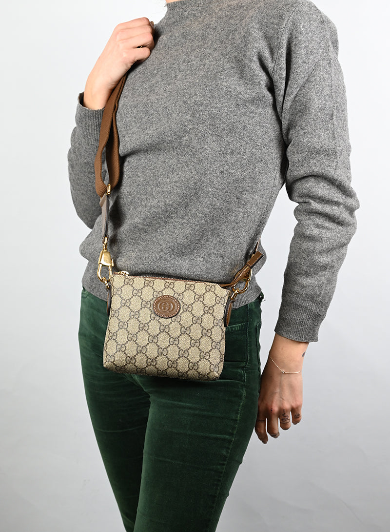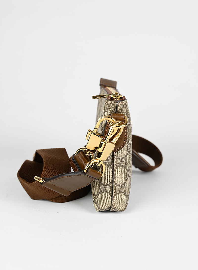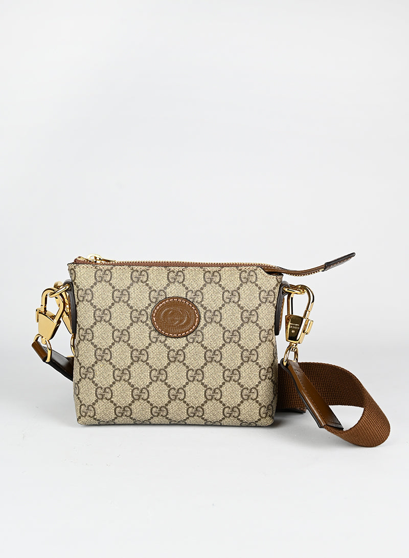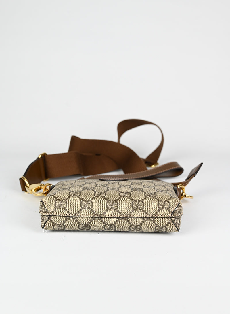 Esclusiva borsa a tracolla Gucci beige in pelle con monogramma GG e tracolla regolabile in tessuto nocciola. Completa di laccio da polso in pelle e chiusura zip oro. Dettagliati profili in pelle marrone e spazioso scomparto interno in canvas ecrù. Un'opera d'arte da portare sempre con sé.