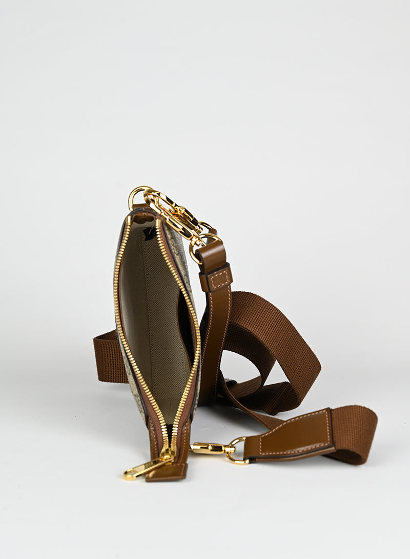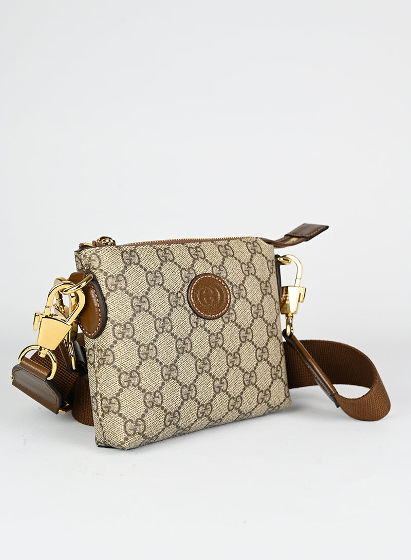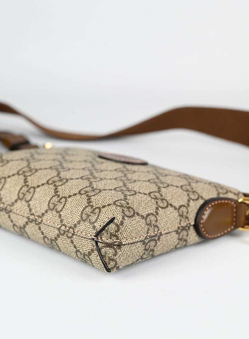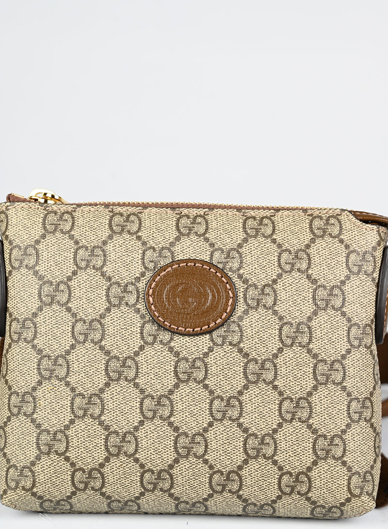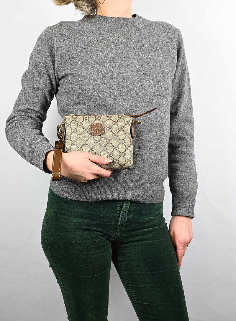 Esclusiva borsa a tracolla Gucci beige in pelle con monogramma GG e tracolla regolabile in tessuto nocciola. Completa di laccio da polso in pelle e chiusura zip oro. Dettagliati profili in pelle marrone e spazioso scomparto interno in canvas ecrù. Un'opera d'arte da portare sempre con sé.
