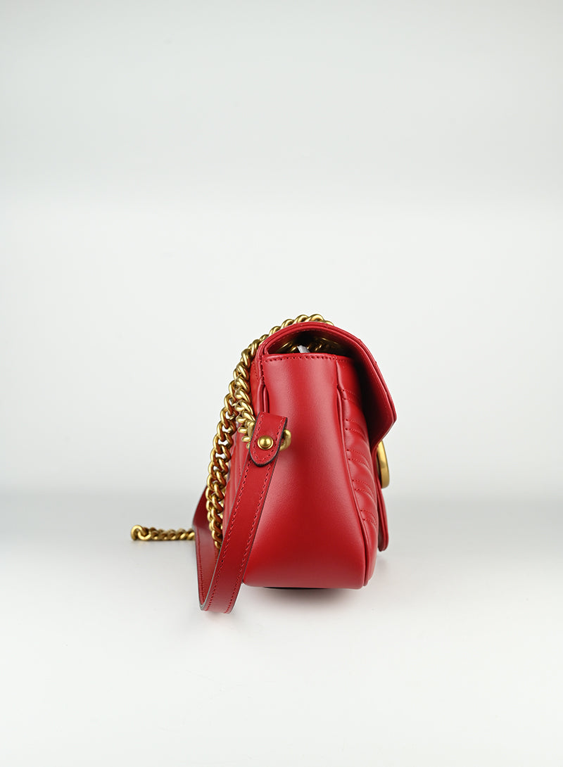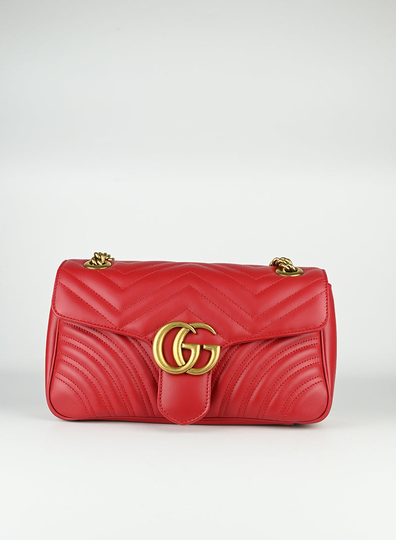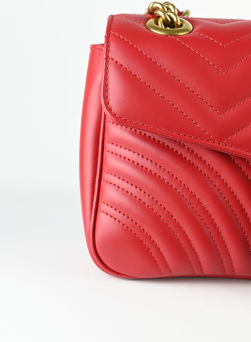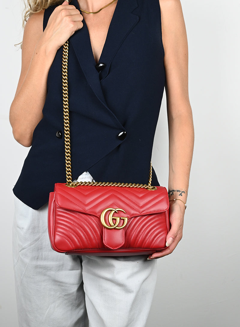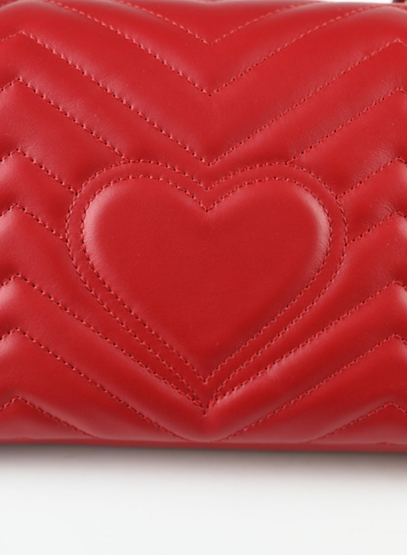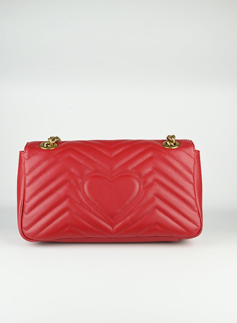 Esplora l'eleganza della borsa Marmont piccola di Gucci. Realizzata in pregiata pelle rossa, presenta uno stile sofisticato con hardware color oro e dettagli trapuntati. Un cuore sul retro aggiunge un tocco di romanticismo. Chiusura a scatto e tracolla catena oro con inserto in pelle ossa garantiscono praticità e comodità. Interno spazioso con taschina zip.
