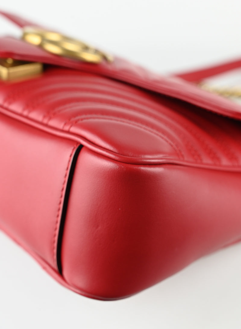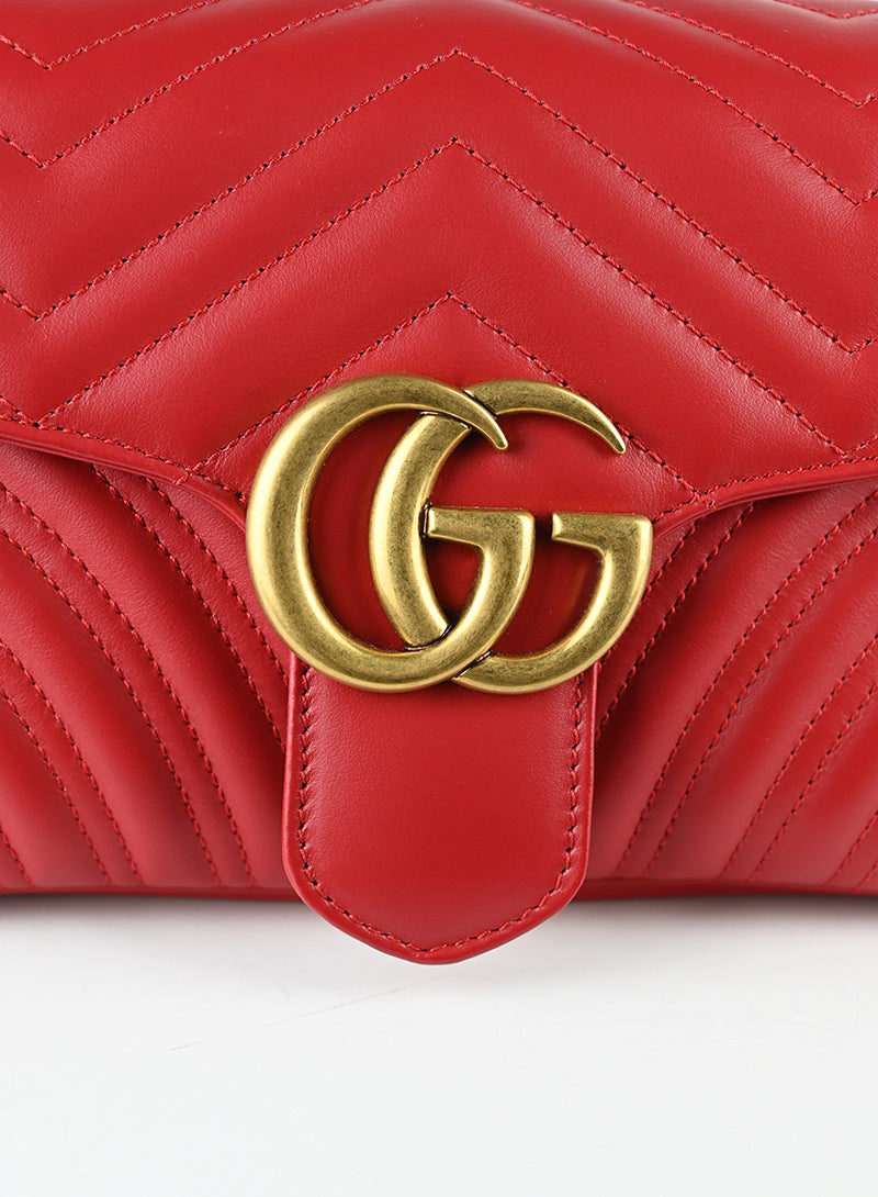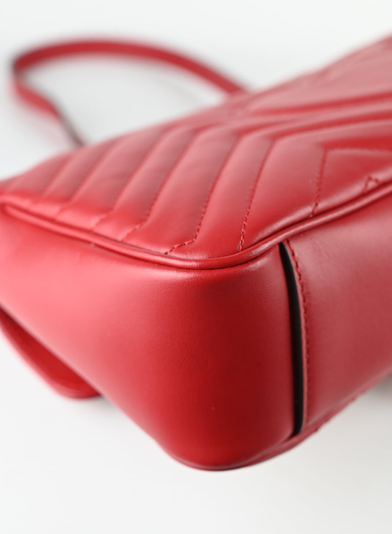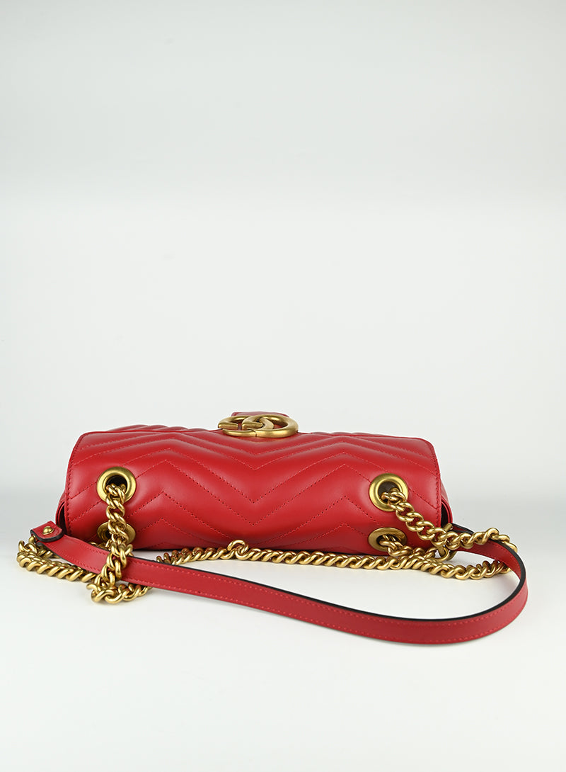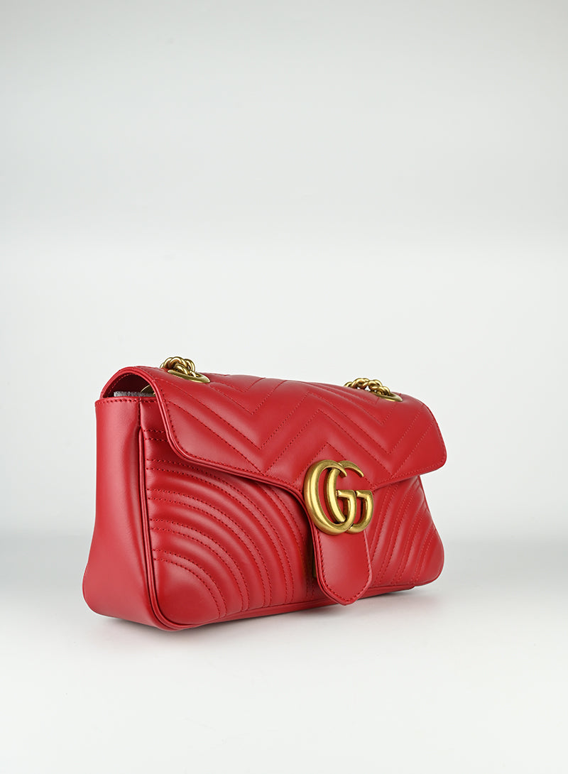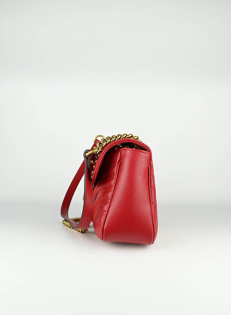 Esplora l'eleganza della borsa Marmont piccola di Gucci. Realizzata in pregiata pelle rossa, presenta uno stile sofisticato con hardware color oro e dettagli trapuntati. Un cuore sul retro aggiunge un tocco di romanticismo. Chiusura a scatto e tracolla catena oro con inserto in pelle ossa garantiscono praticità e comodità. Interno spazioso con taschina zip.