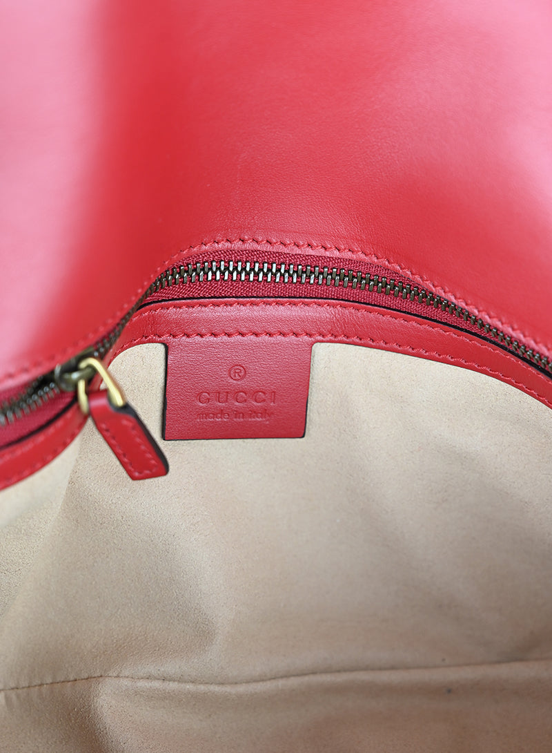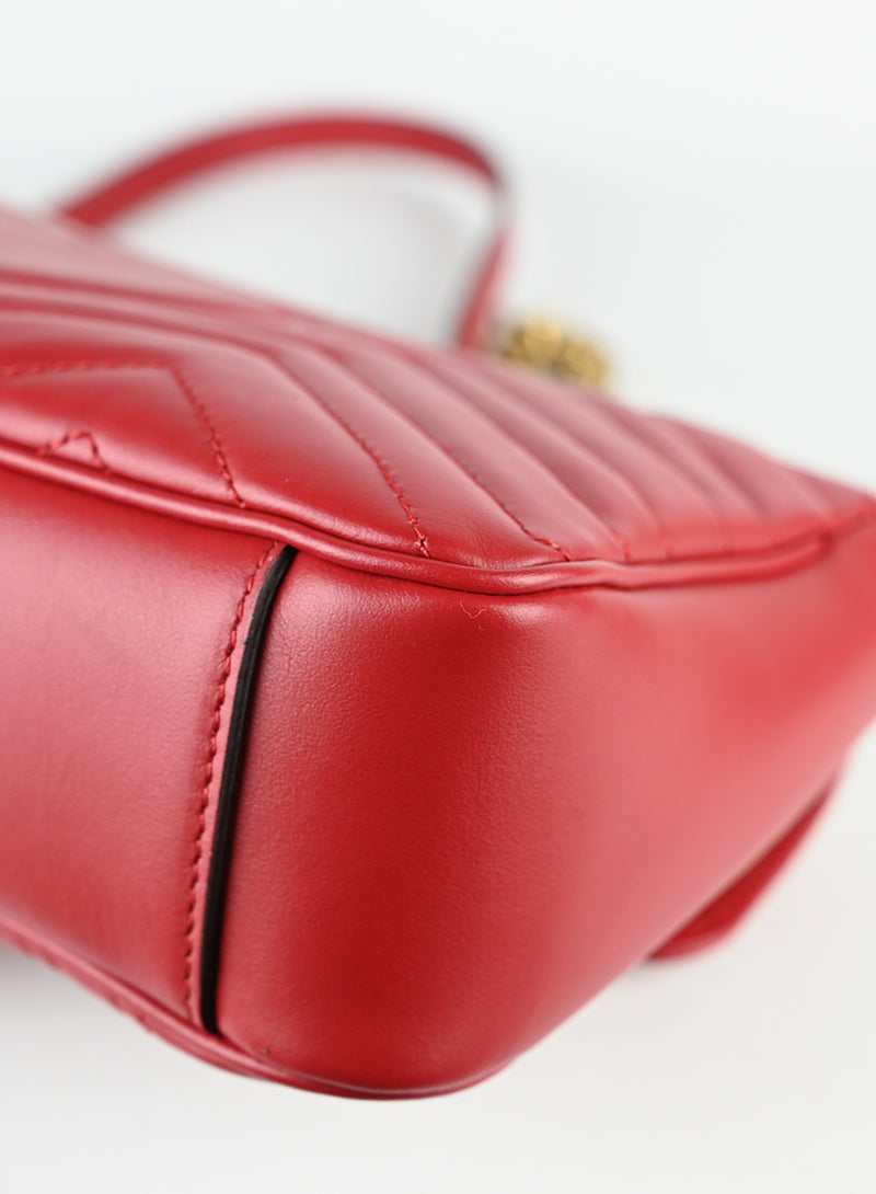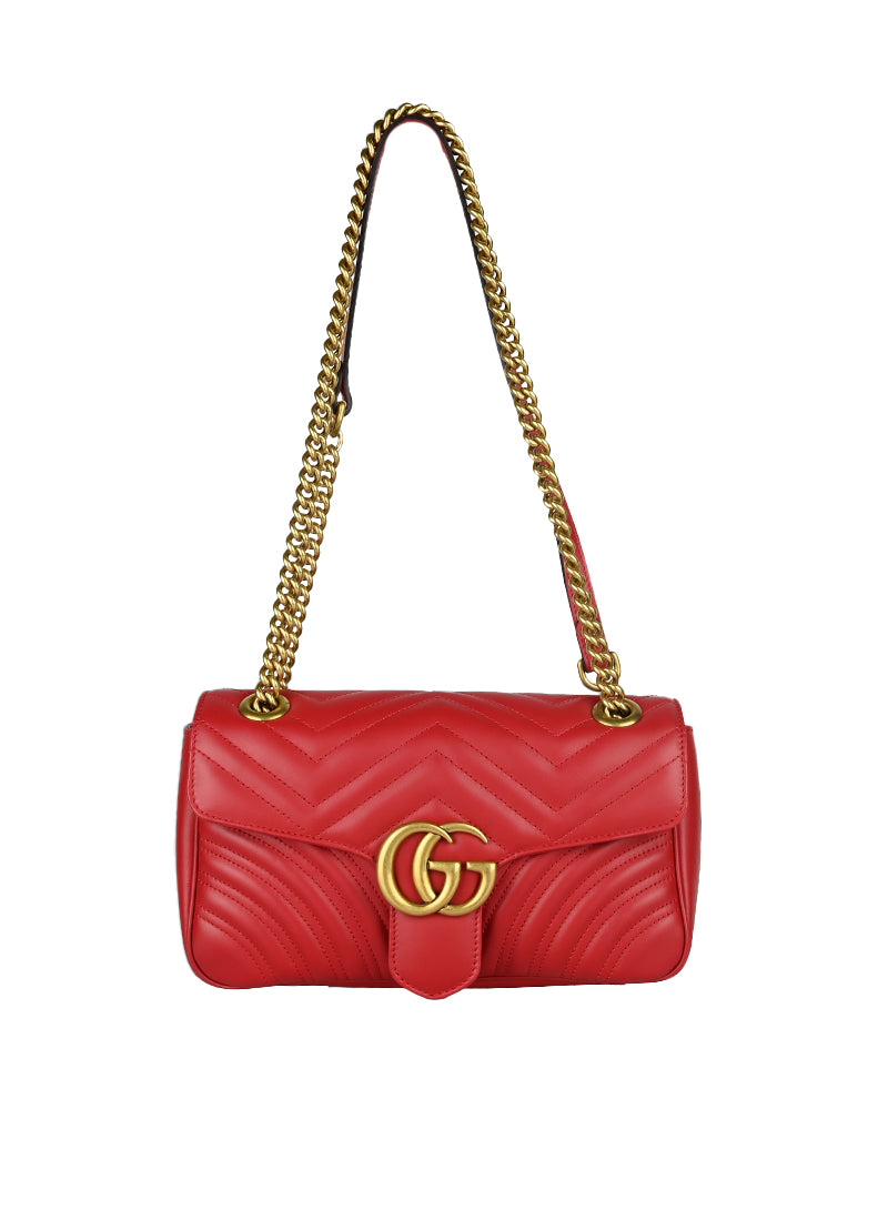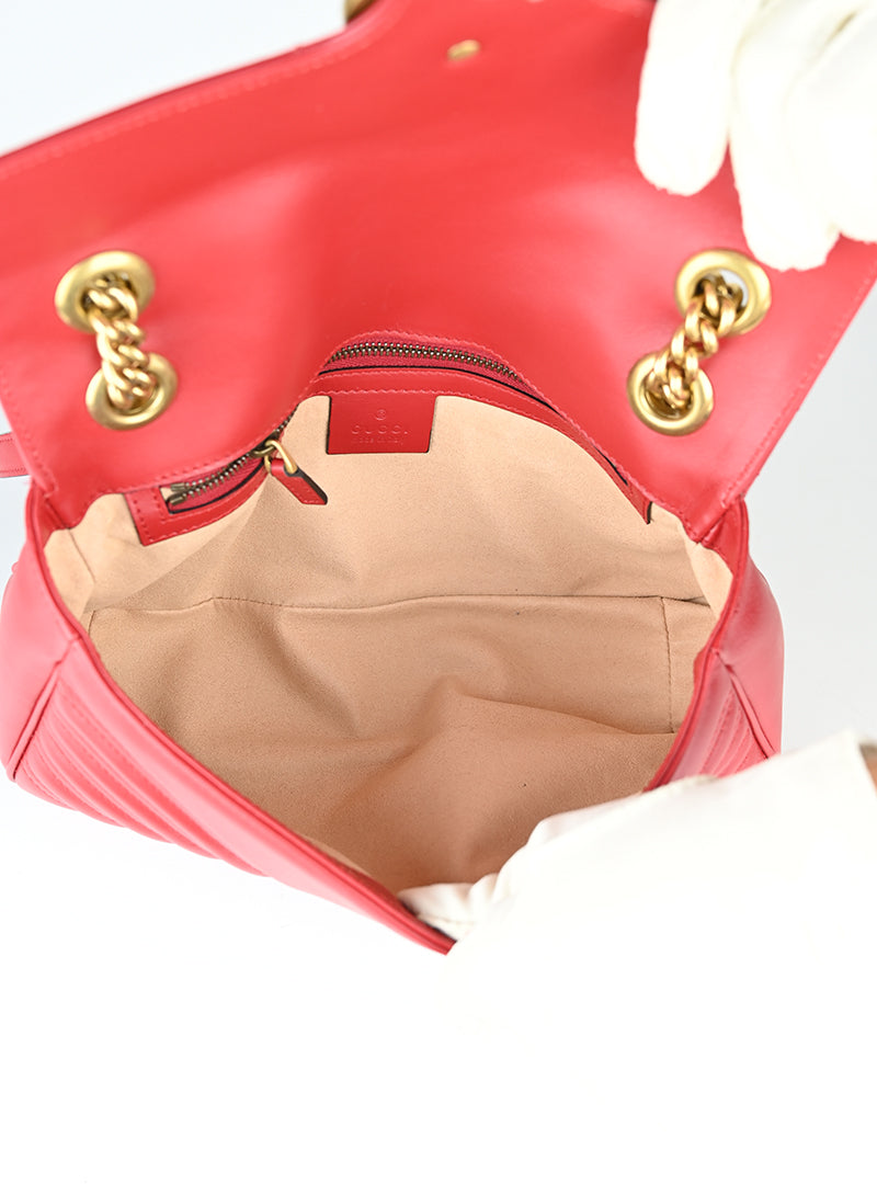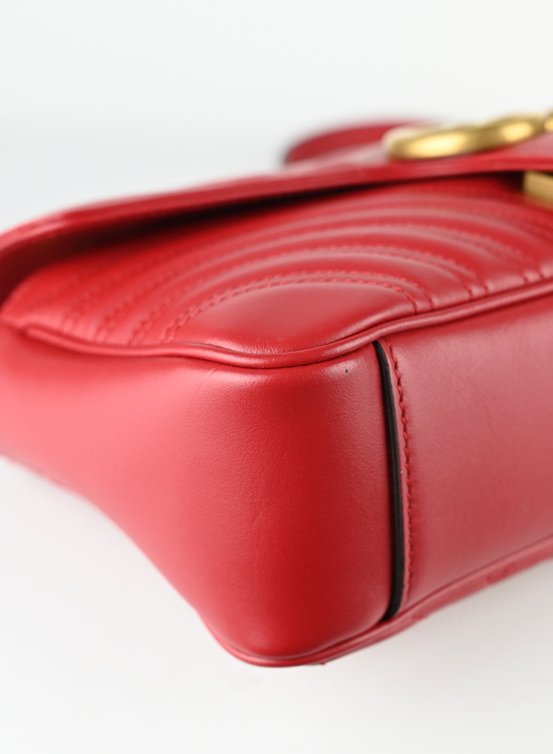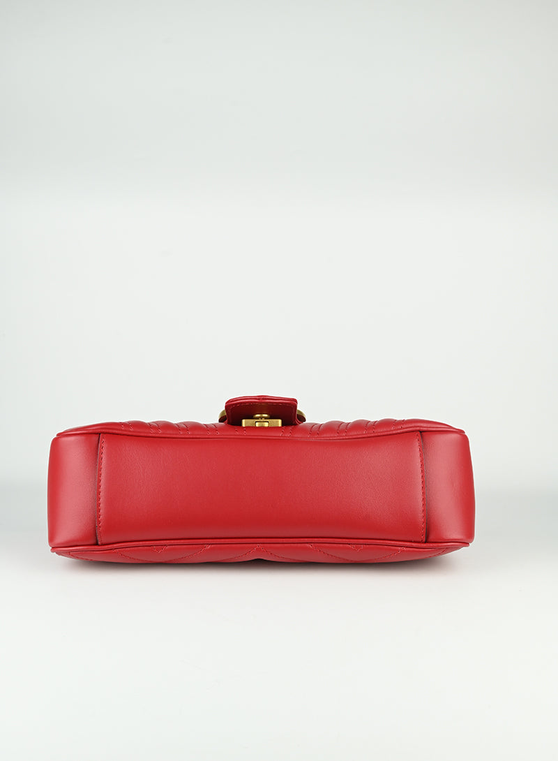 Esplora l'eleganza della borsa Marmont piccola di Gucci. Realizzata in pregiata pelle rossa, presenta uno stile sofisticato con hardware color oro e dettagli trapuntati. Un cuore sul retro aggiunge un tocco di romanticismo. Chiusura a scatto e tracolla catena oro con inserto in pelle ossa garantiscono praticità e comodità. Interno spazioso con taschina zip.