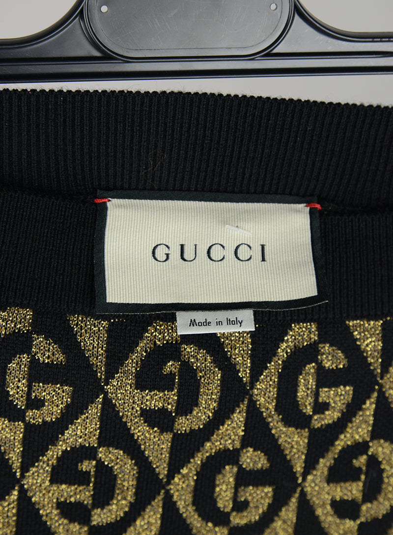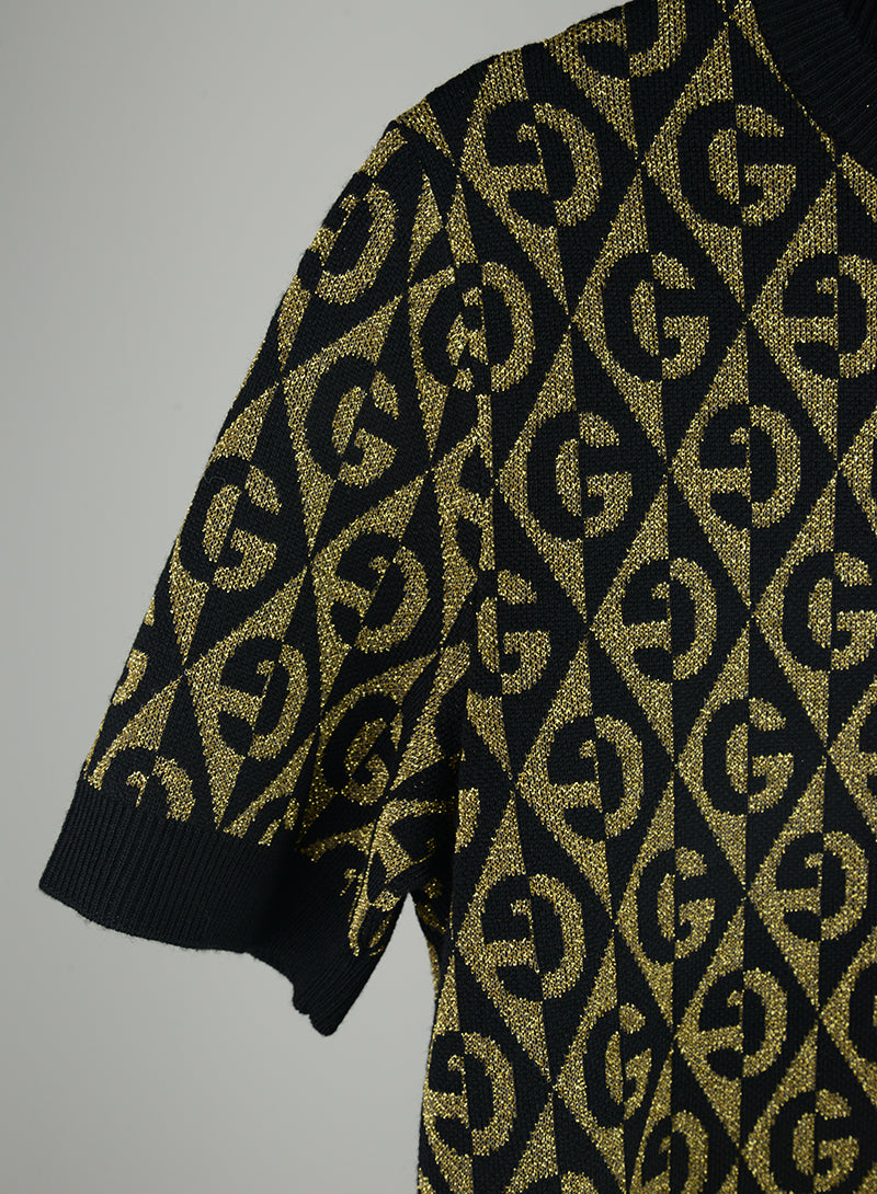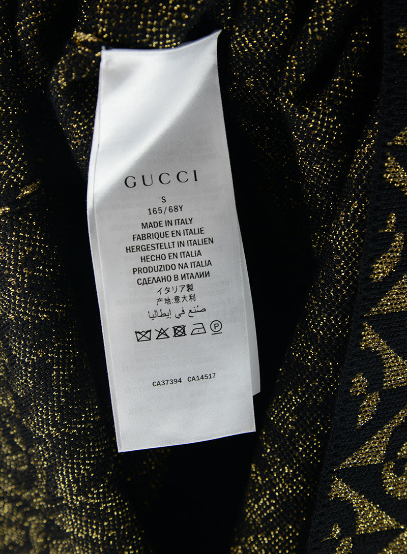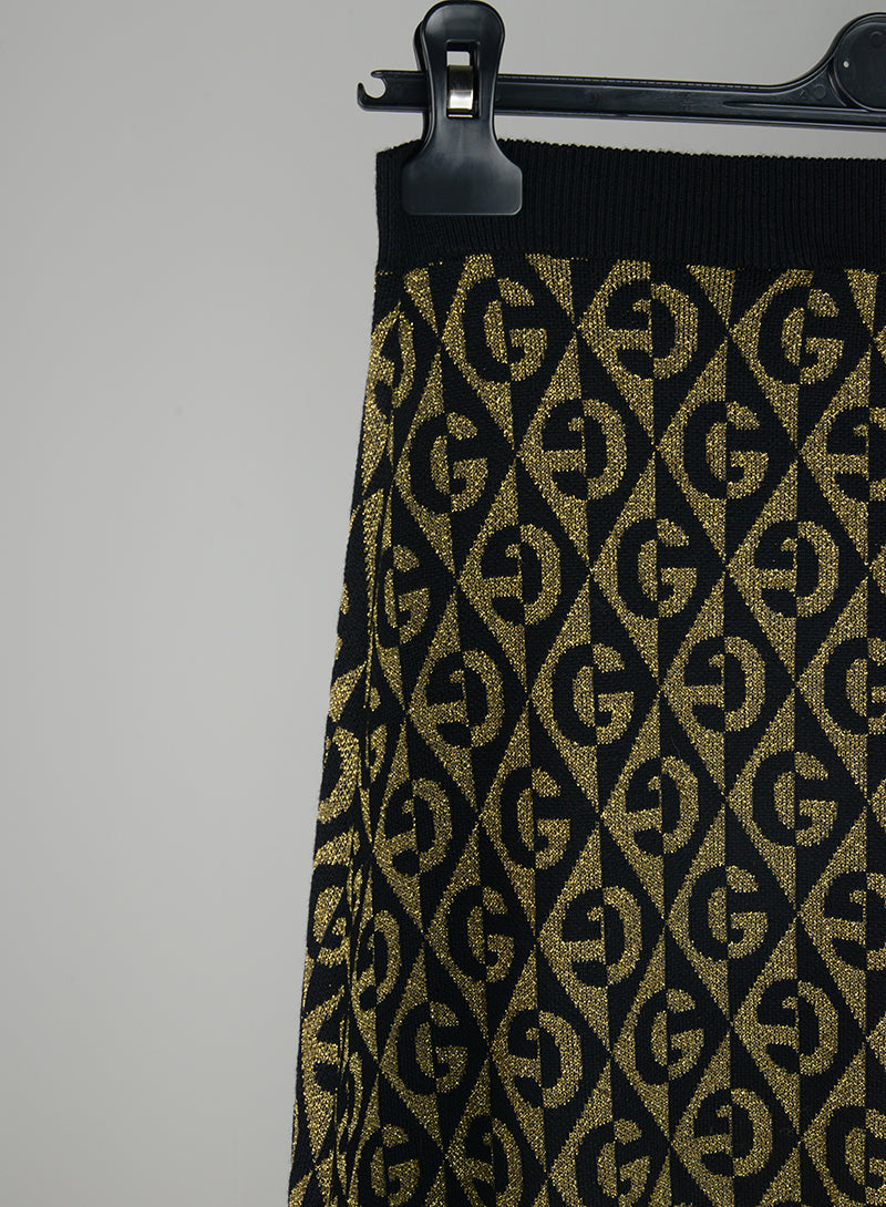 Elegante completo Gucci, nero e oro in lurex, con pull a maniche corte e gonna longuette. Perfetto per un look sofisticato e di classe, dai dettagli GG esclusivi. Il tessuto luccicante dona un tocco di eleganza e stile, perfetto per le occasioni speciali.