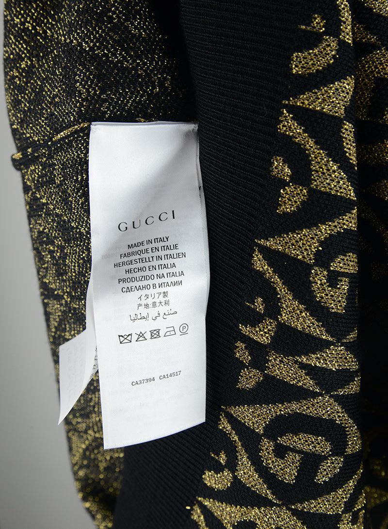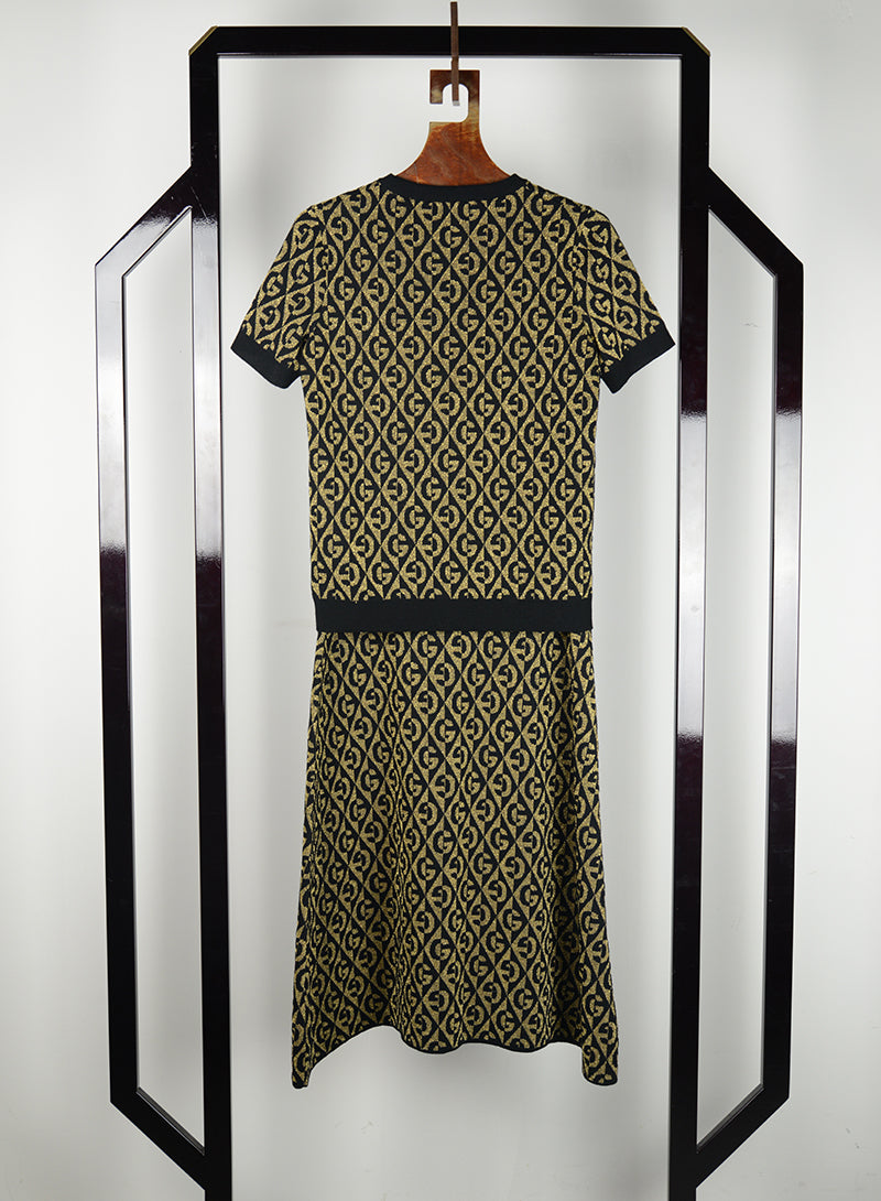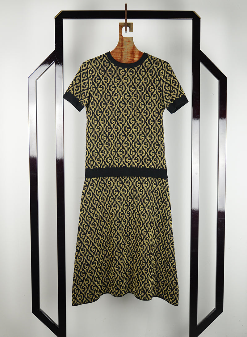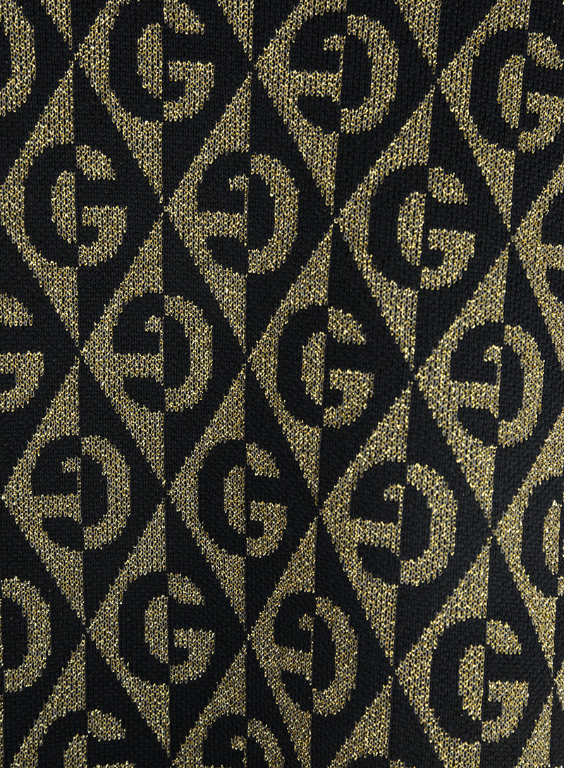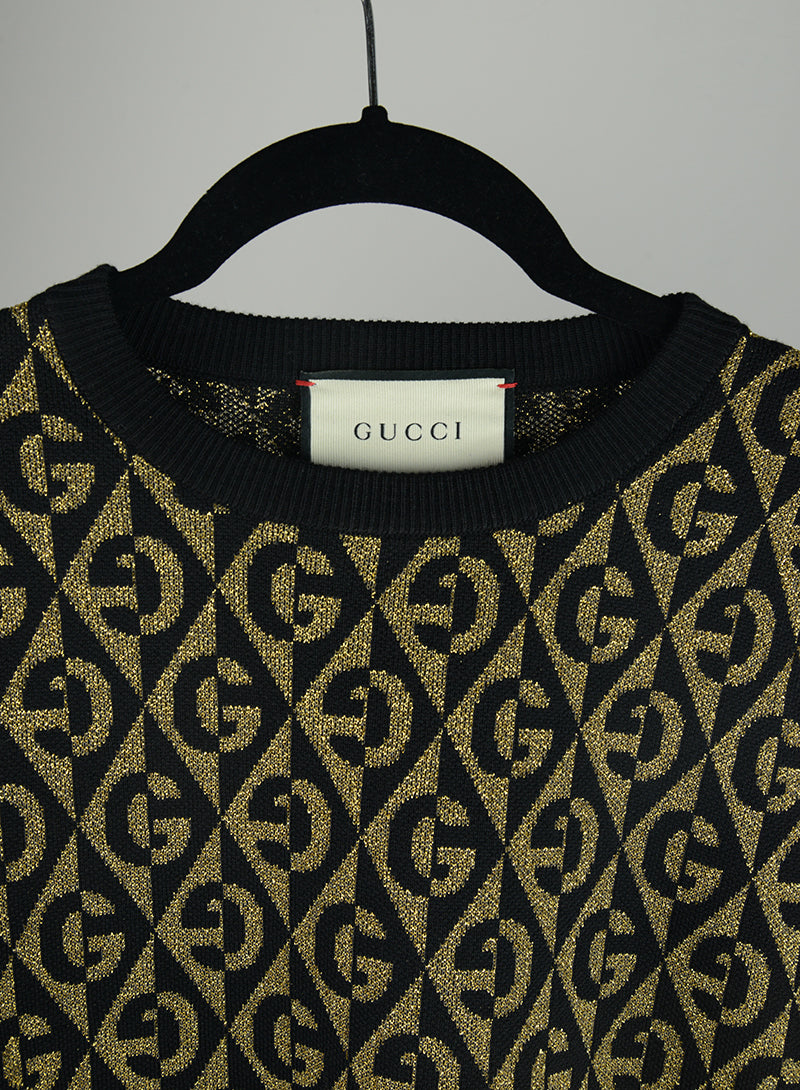 Elegante completo Gucci, nero e oro in lurex, con pull a maniche corte e gonna longuette. Perfetto per un look sofisticato e di classe, dai dettagli GG esclusivi. Il tessuto luccicante dona un tocco di eleganza e stile, perfetto per le occasioni speciali.