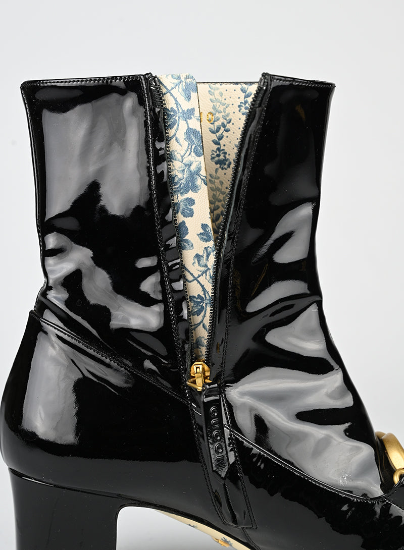 Perfetti per qualsiasi occasione, questi stivaletti in vernice nera con la caratteristica punta tonda e il logo GG oro avanti ti faranno sentire elegante e sofisticata. Con un comodo tacco basso e una chiusura a zip, l'interno in pelle stampa fiori azzurri ti garantirà un comfort lussuoso. Indossa un pezzo di arte ai tuoi piedi con questi Gucci Stivaletti invernali.