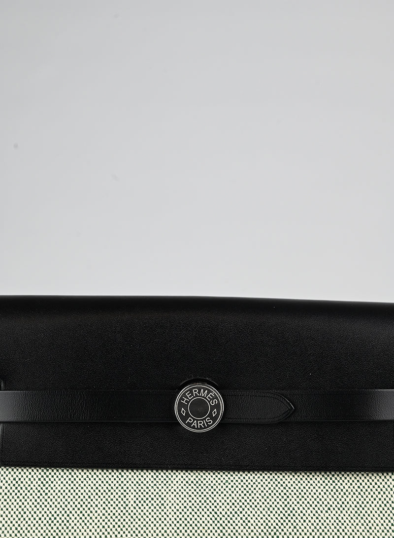 Hermès Herbag 20, l'icona di eleganza versatile. Realizzata in pregiato canvas beige-verde Toile, questa borsa a tracolla incarna lo stile senza tempo della maison francese. La patta e la tracolla in pelle box nera con hardware palladio conferiscono un tocco di raffinatezza, mentre la tasca con zip sul retro aggiunge praticità. Perfetta per chi ricerca un accessorio sofisticato, funzionale e dal fascino intramontabile.
