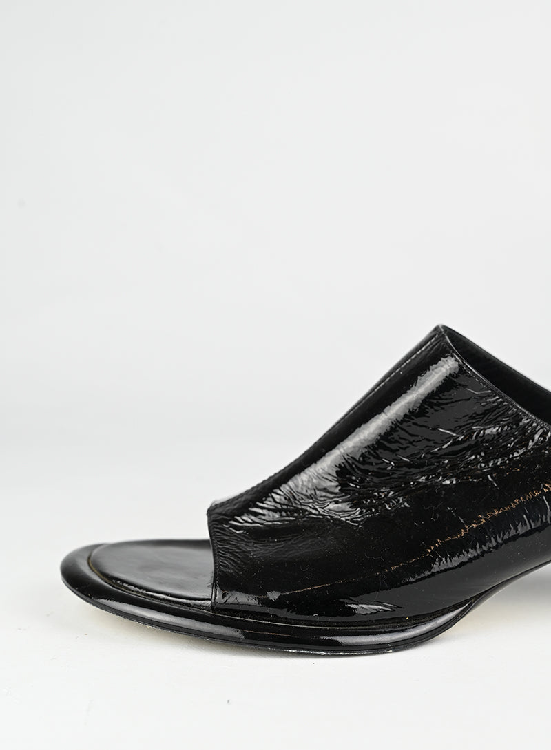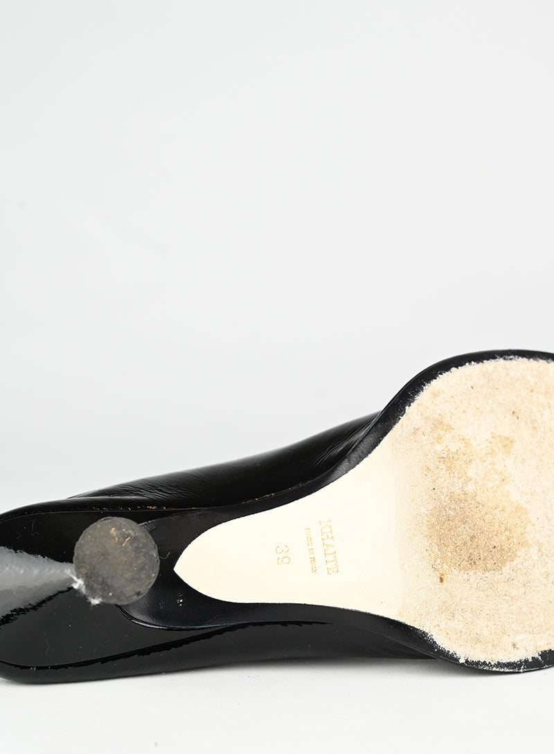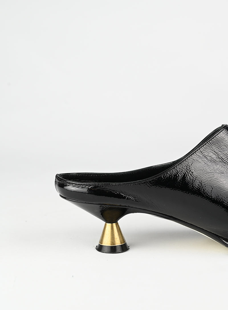 Eleganti sandali Khaite in vernice nera lucida, caratterizzati da una fascia larga che avvolge il piede con comfort e stile. La pianta tonda e generosa offre spaziosità senza compromessi, mentre il tacco ottone a rocchetto aggiunge un tocco di raffinatezza vintage. Un capolavoro di design che unisce praticità e lusso, perfetto per chi ricerca un accessorio sofisticato e versatile da indossare in ogni occasione.