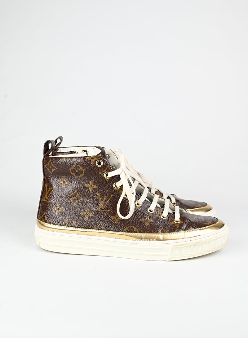 Sneaker Louis Vuitton in tela monogram che incarna l'eleganza senza tempo. Realizzate nella tela monogram caratteristica con tonalità calde di marrone e beige, queste sneaker numero 39 presentano una raffinata para bianca profilata in oro. I lacci bianchi immacolati e la pratica zip laterale combinano stile e funzionalità. Un pezzo ricercato per la collezionista esigente che apprezza il lusso autentico e la sofisticatezza discreta nel proprio guardaroba vintage.