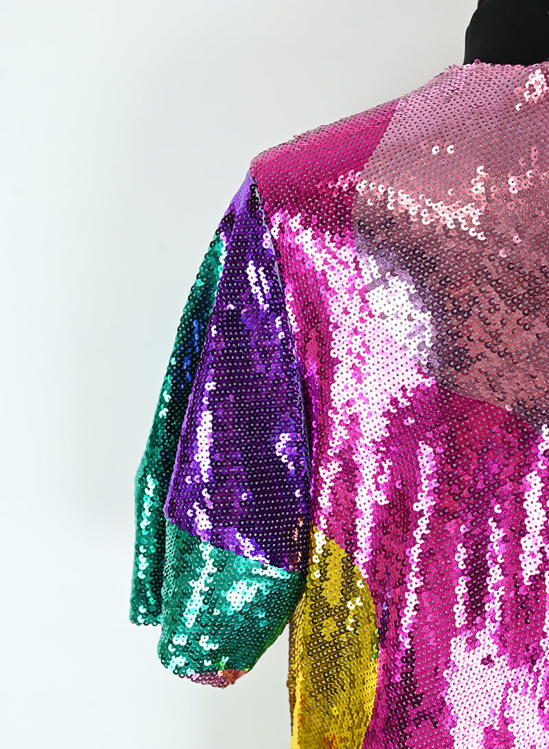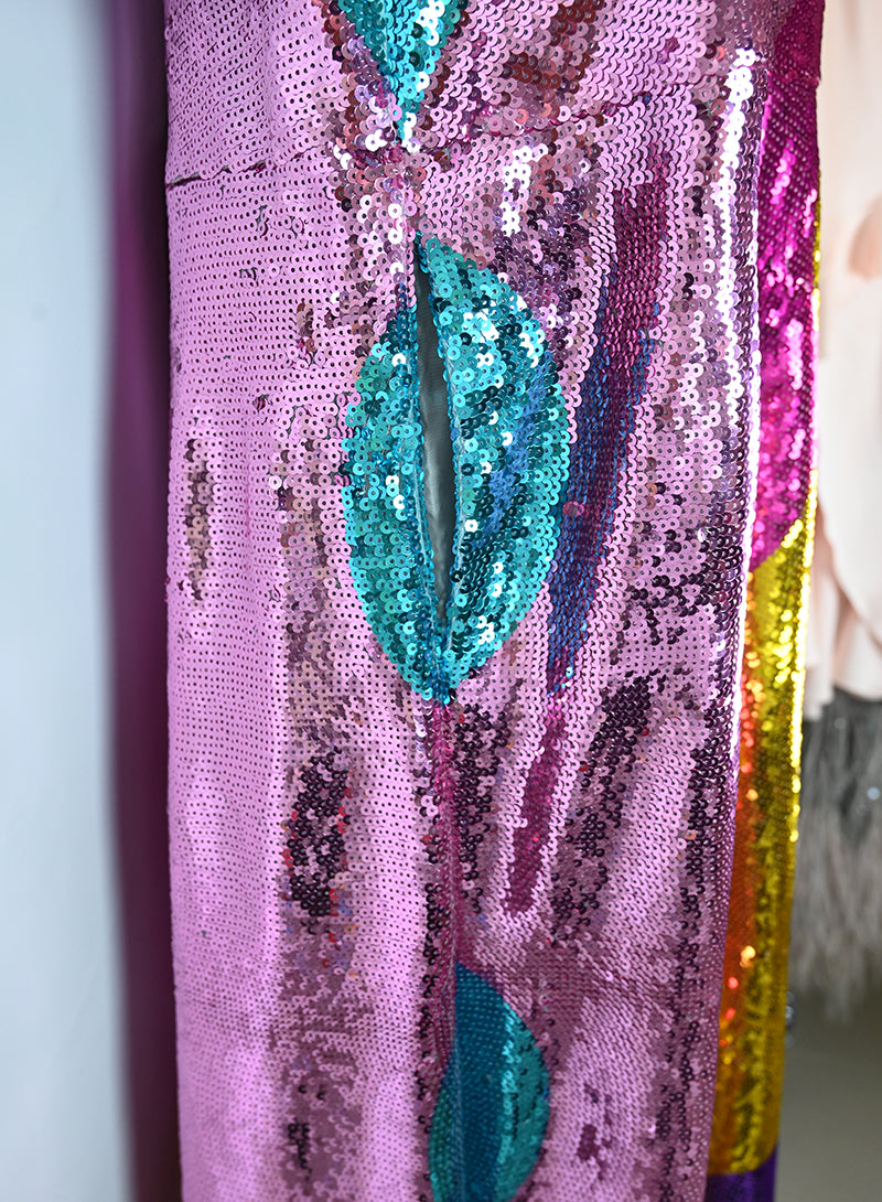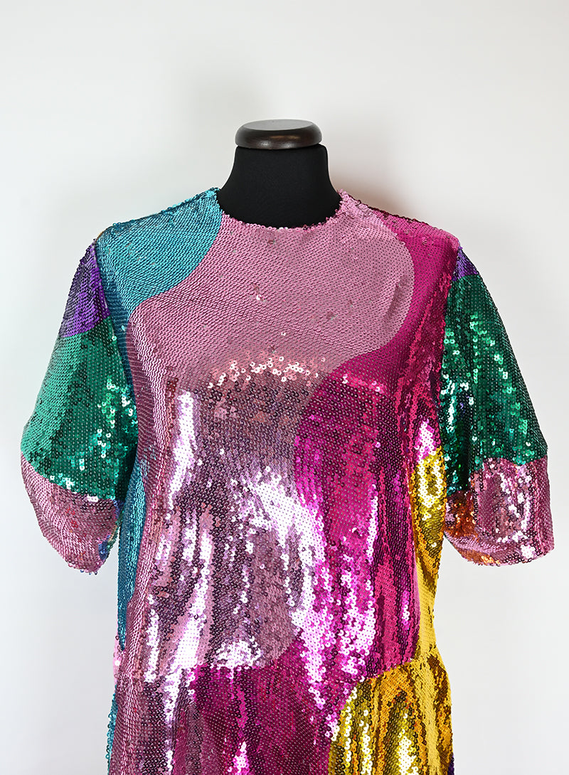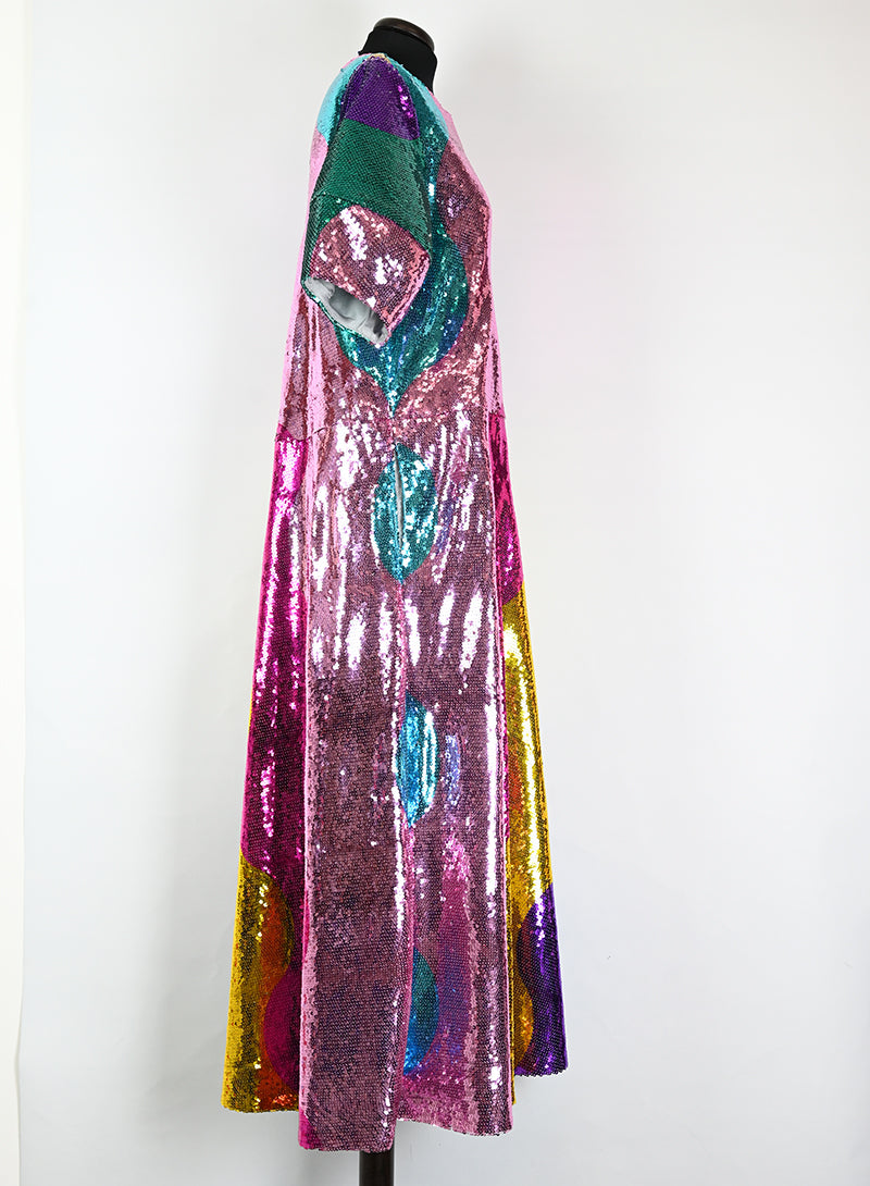 Questo elegante abito lungo di Mira Mikati è un'opera d'arte dai colori vivaci. Grazie alle paillettes multicolor che ricoprono l'intera superficie e alla gonna svasata, questo abito cattura la luce e attira gli sguardi. Le maniche corte e le tasche a scomparsa lo rendono pratico e funzionale, mentre la chiusura con zip sul retro garantisce una vestibilità perfetta. Indossalo per un look esclusivo e glamour.
