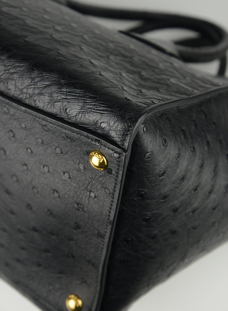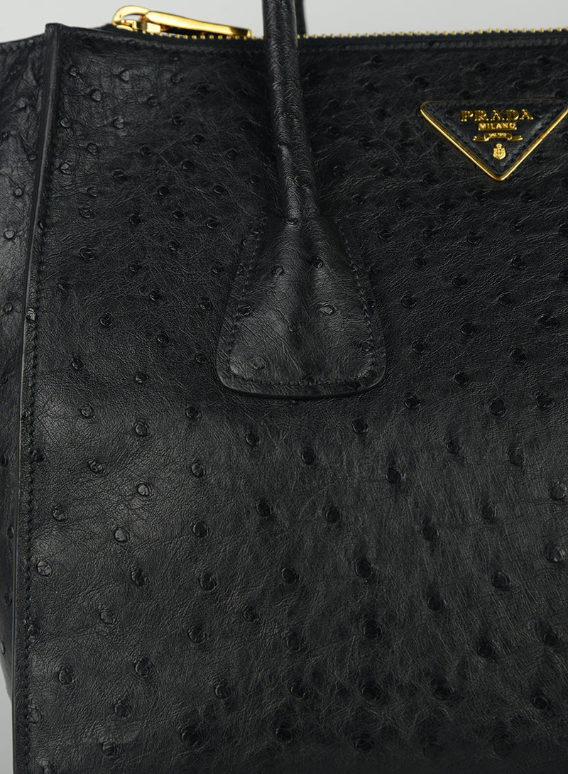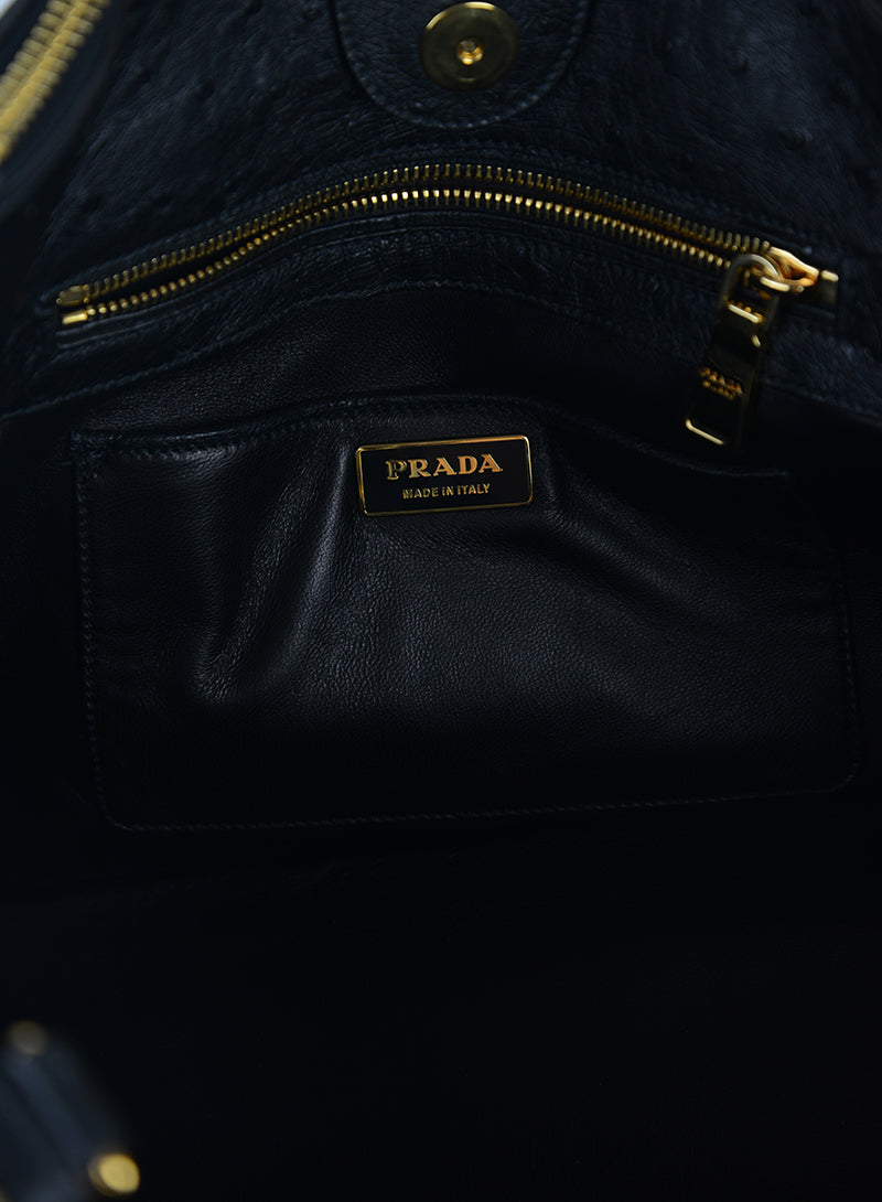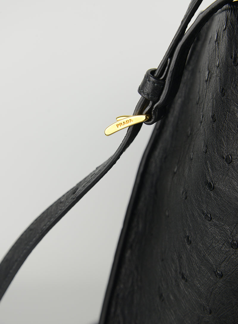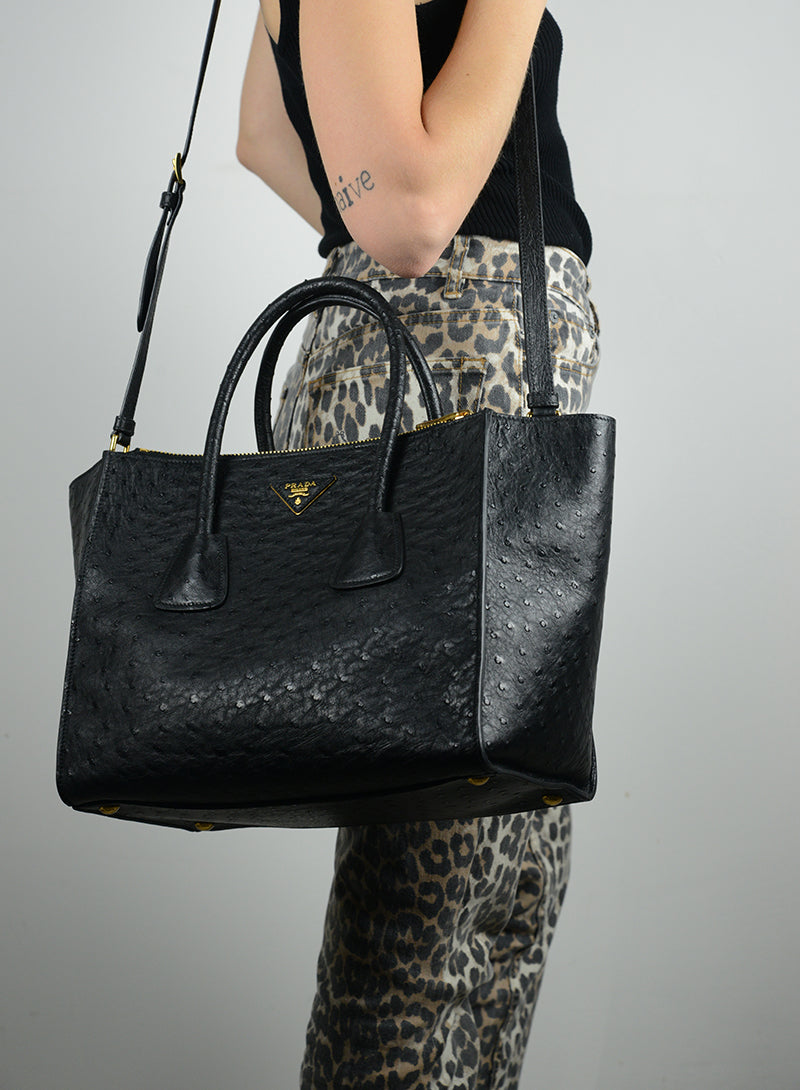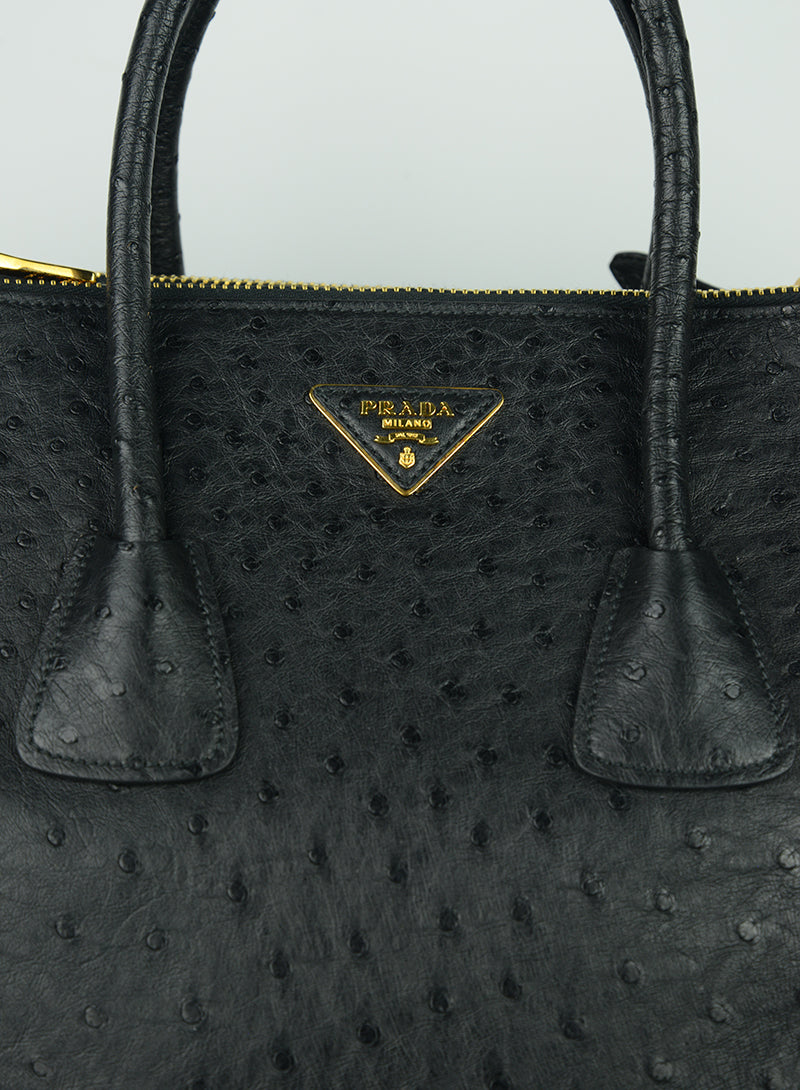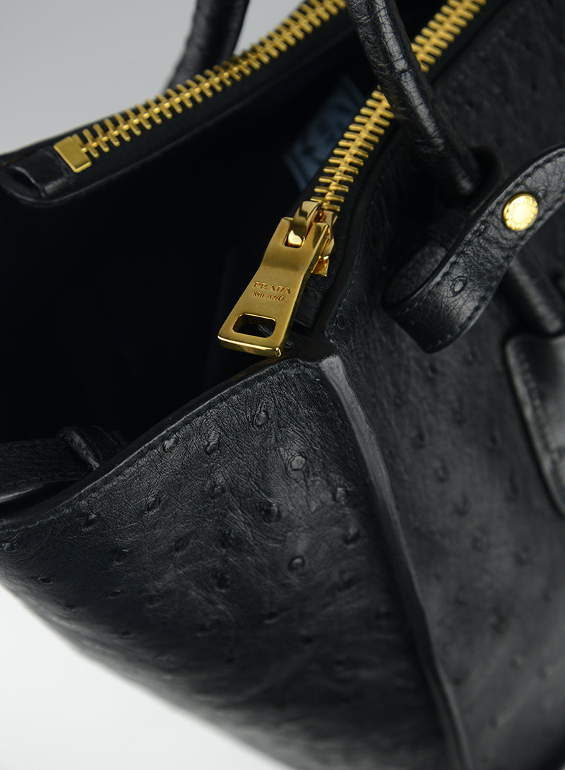 La borsa Prada in pregiata pelle di struzzo unisce eleganza e funzionalità con i suoi 3 scompartimenti, tra cui 2 con zip, e tasca con zip interna. Con hardware oro e chiusura magnetica, può essere portata a mano o a spalla con la tracolla. Aggiunge un tocco di lusso a ogni outfit.