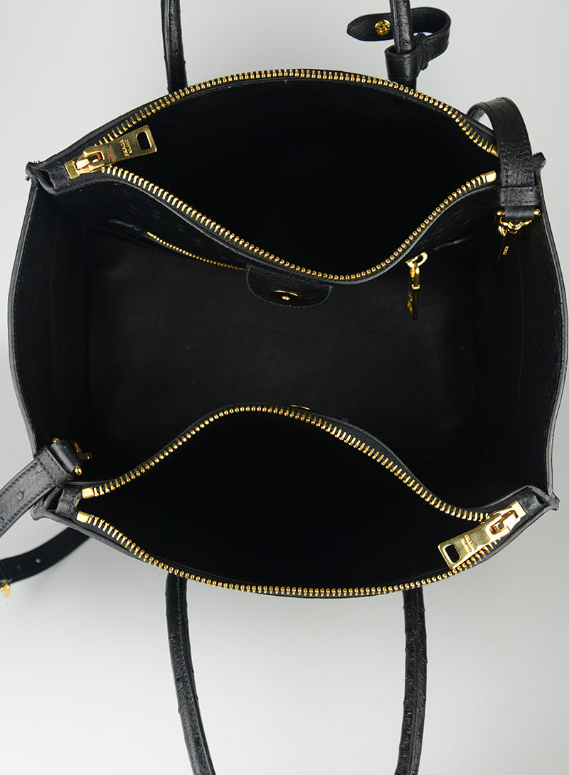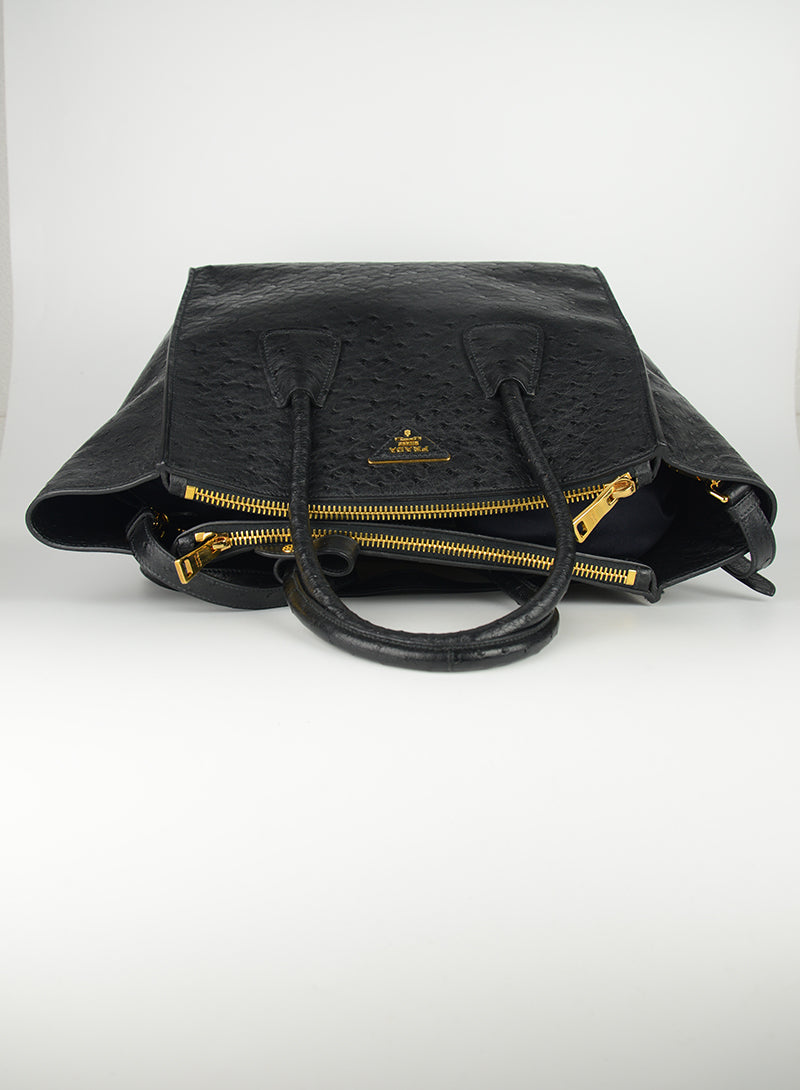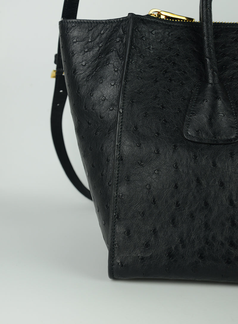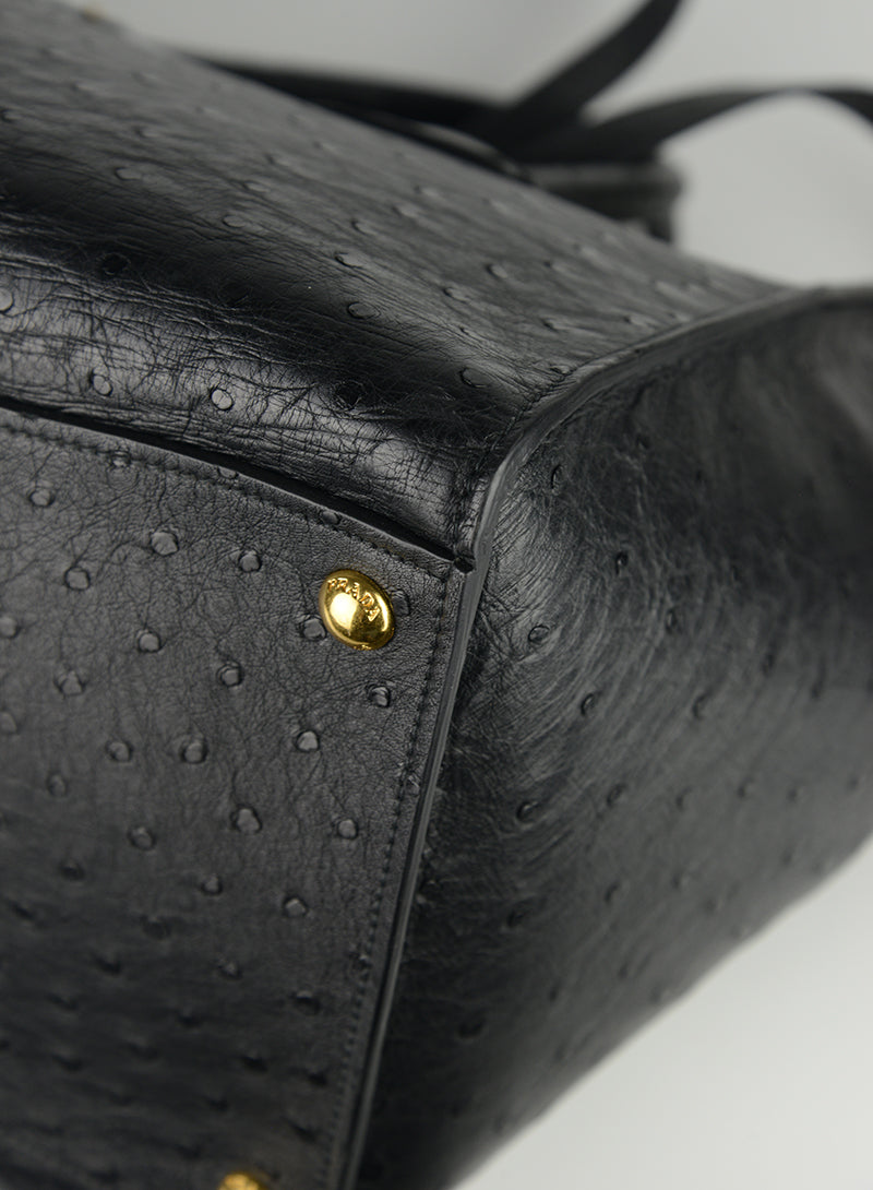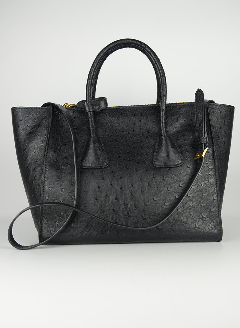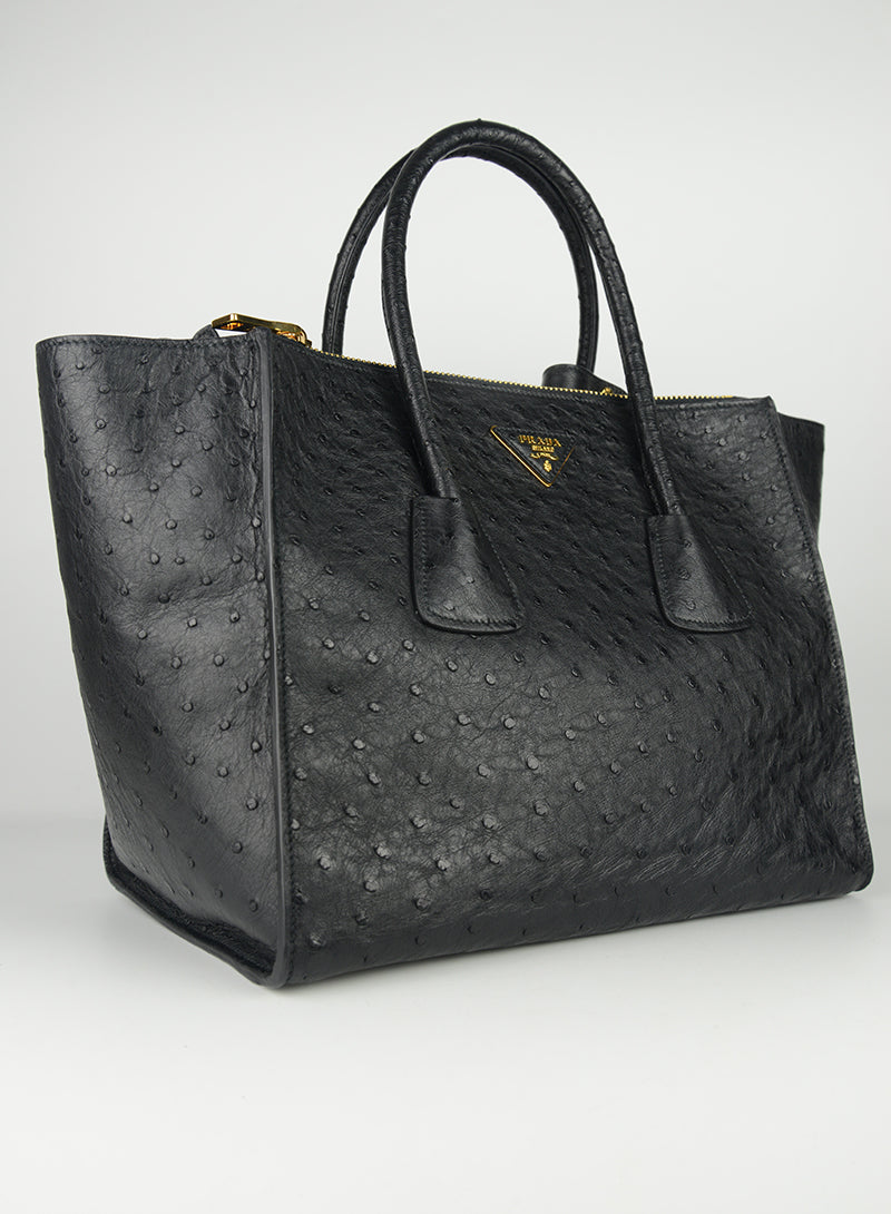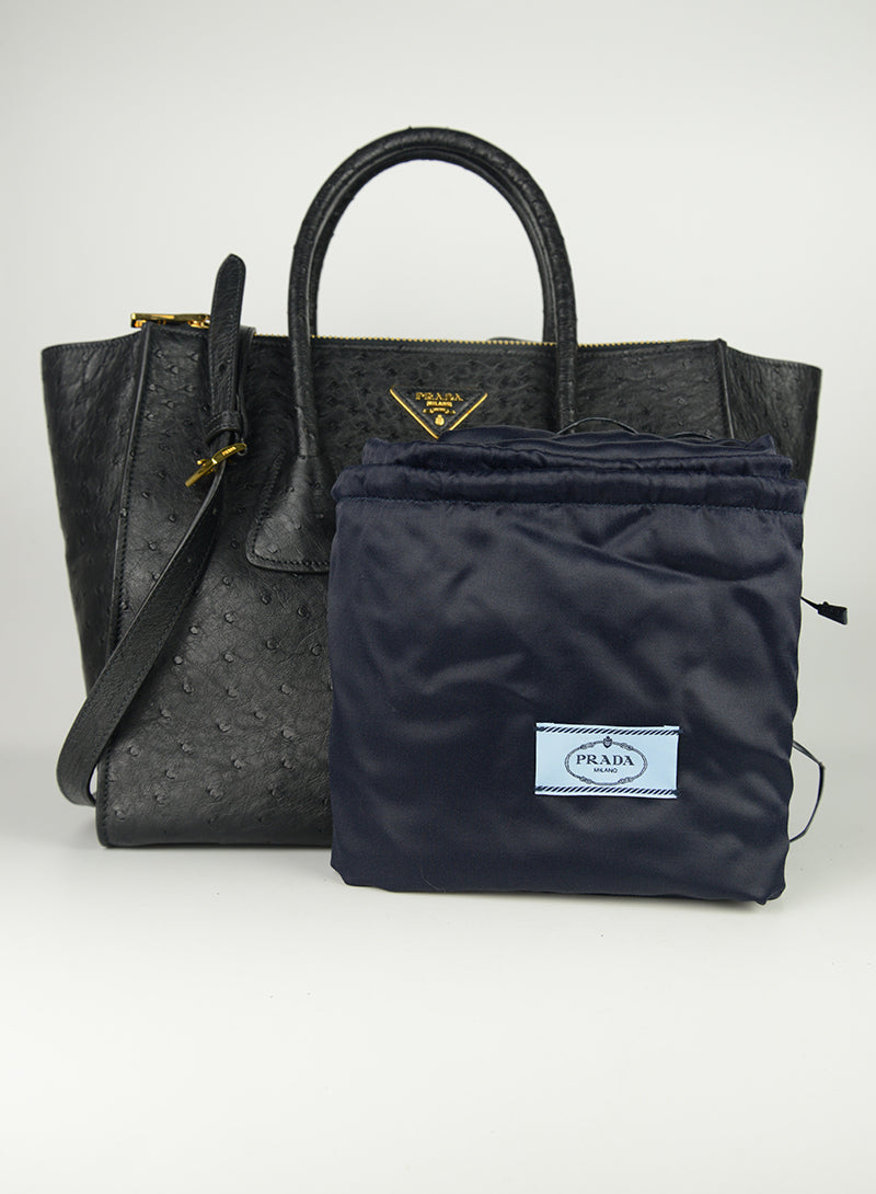 La borsa Prada in pregiata pelle di struzzo unisce eleganza e funzionalità con i suoi 3 scompartimenti, tra cui 2 con zip, e tasca con zip interna. Con hardware oro e chiusura magnetica, può essere portata a mano o a spalla con la tracolla. Aggiunge un tocco di lusso a ogni outfit.