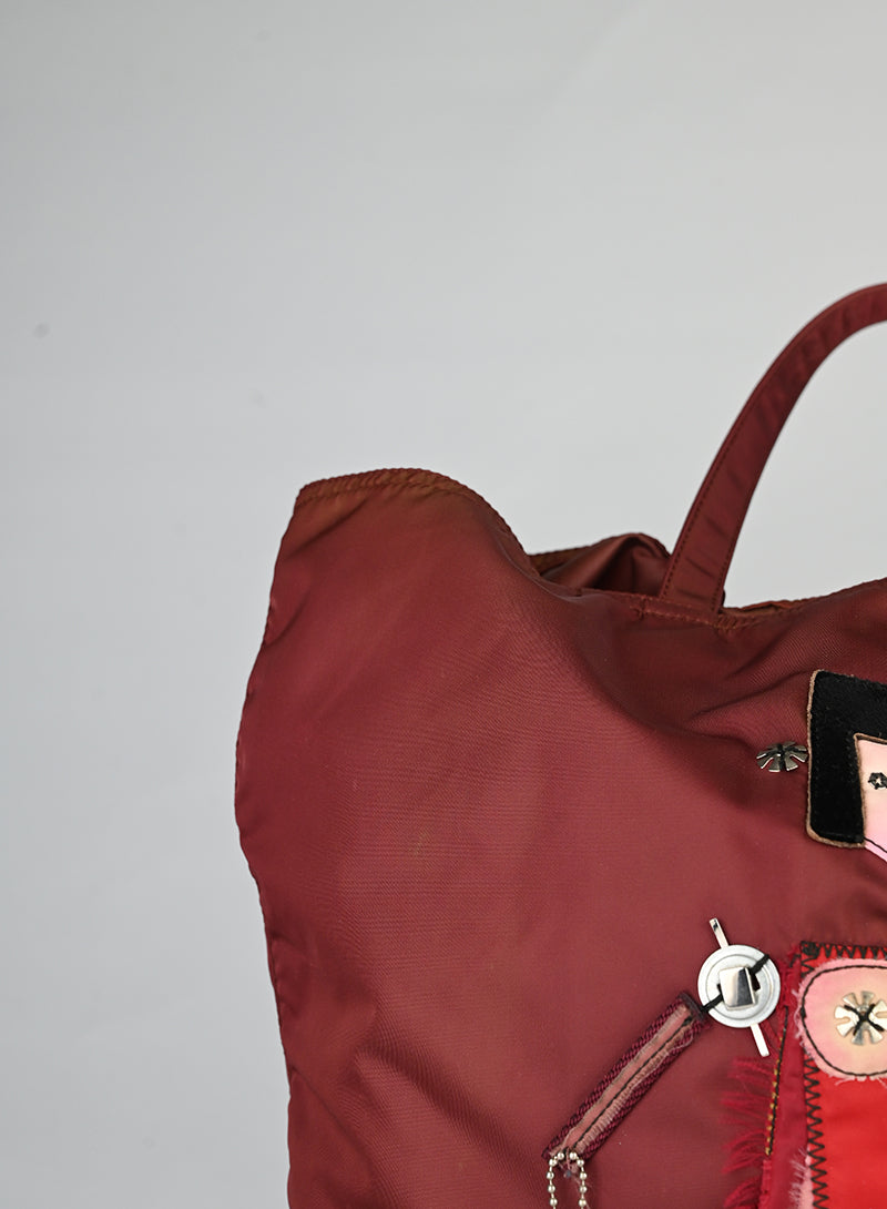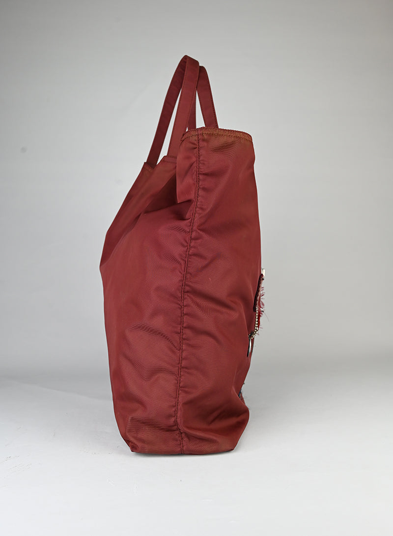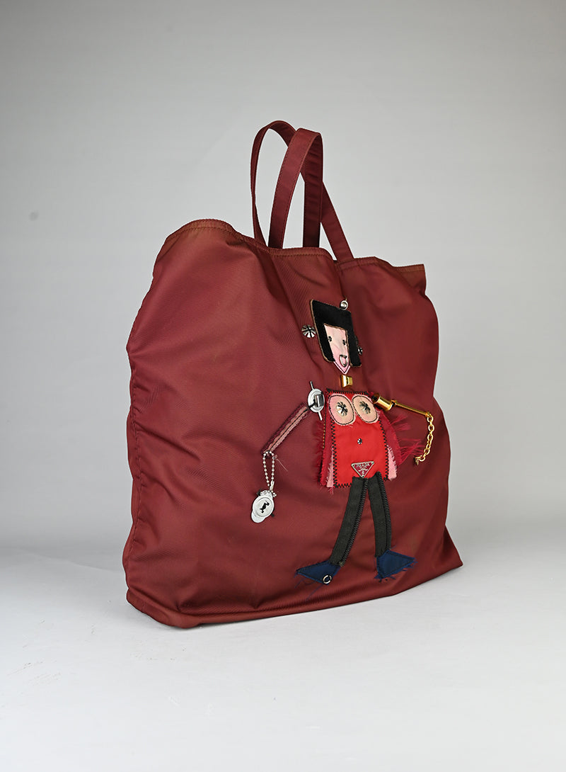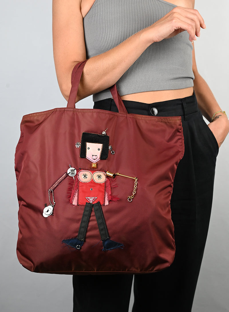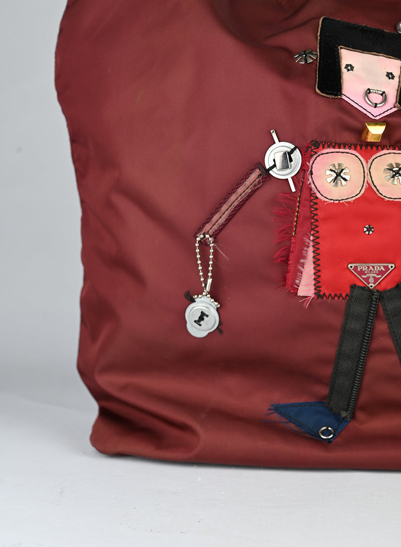 La tote bag Prada in nylon bordeaux unisce eleganza e funzionalità con un ricamo originale a motivo robot e il classico logo triangolare in metallo. Dotata di due manici corti, presenta un interno sfoderato con un unico scompartimento e una taschina con zip, ideale per mantenere ordine con stile discreto e raffinato. Un accessorio sofisticato per chi cerca un tocco distintivo nella praticità quotidiana.