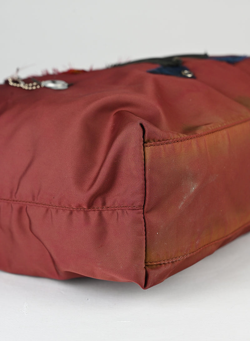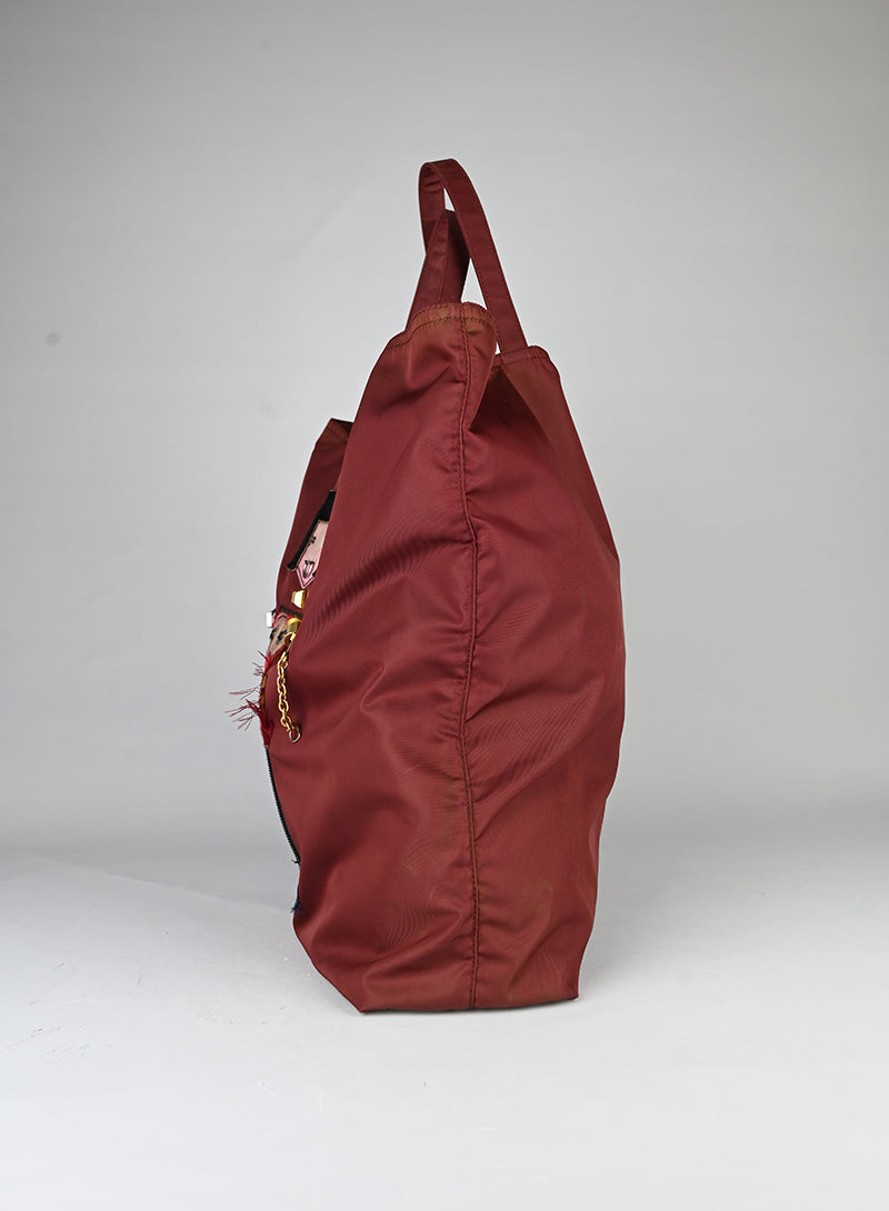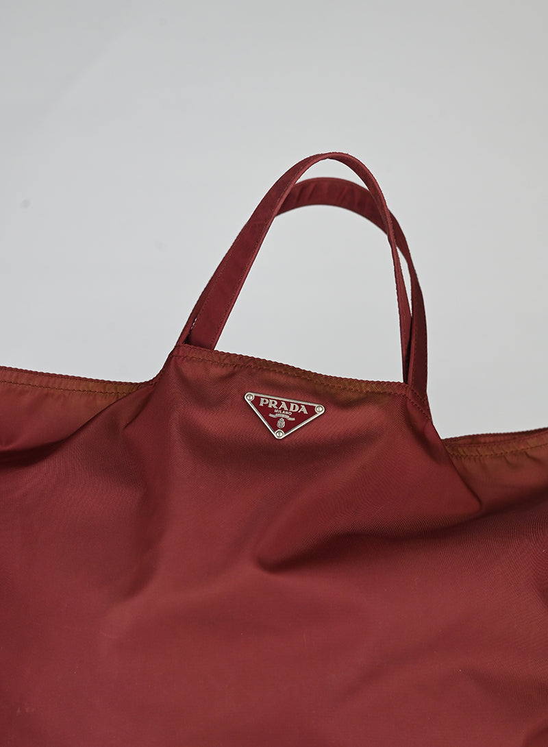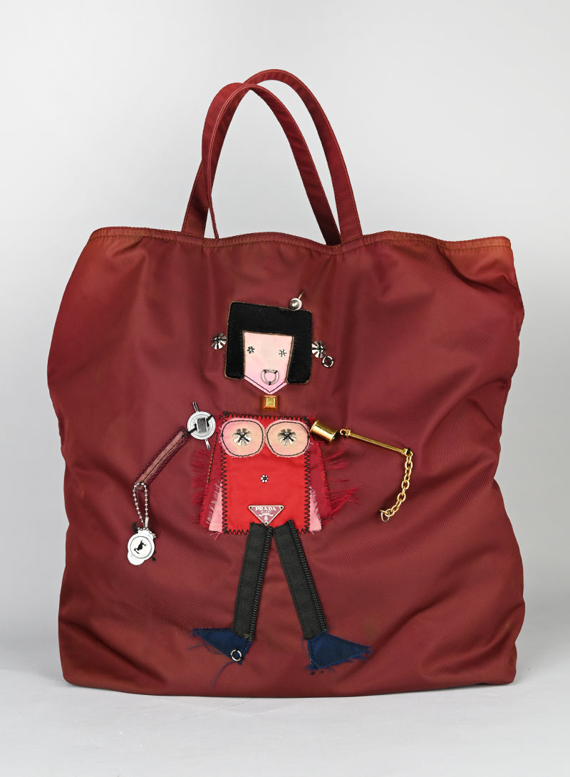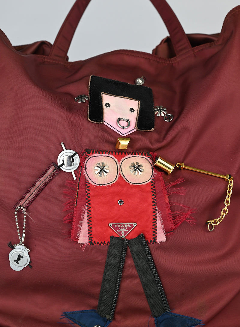 La tote bag Prada in nylon bordeaux unisce eleganza e funzionalità con un ricamo originale a motivo robot e il classico logo triangolare in metallo. Dotata di due manici corti, presenta un interno sfoderato con un unico scompartimento e una taschina con zip, ideale per mantenere ordine con stile discreto e raffinato. Un accessorio sofisticato per chi cerca un tocco distintivo nella praticità quotidiana.