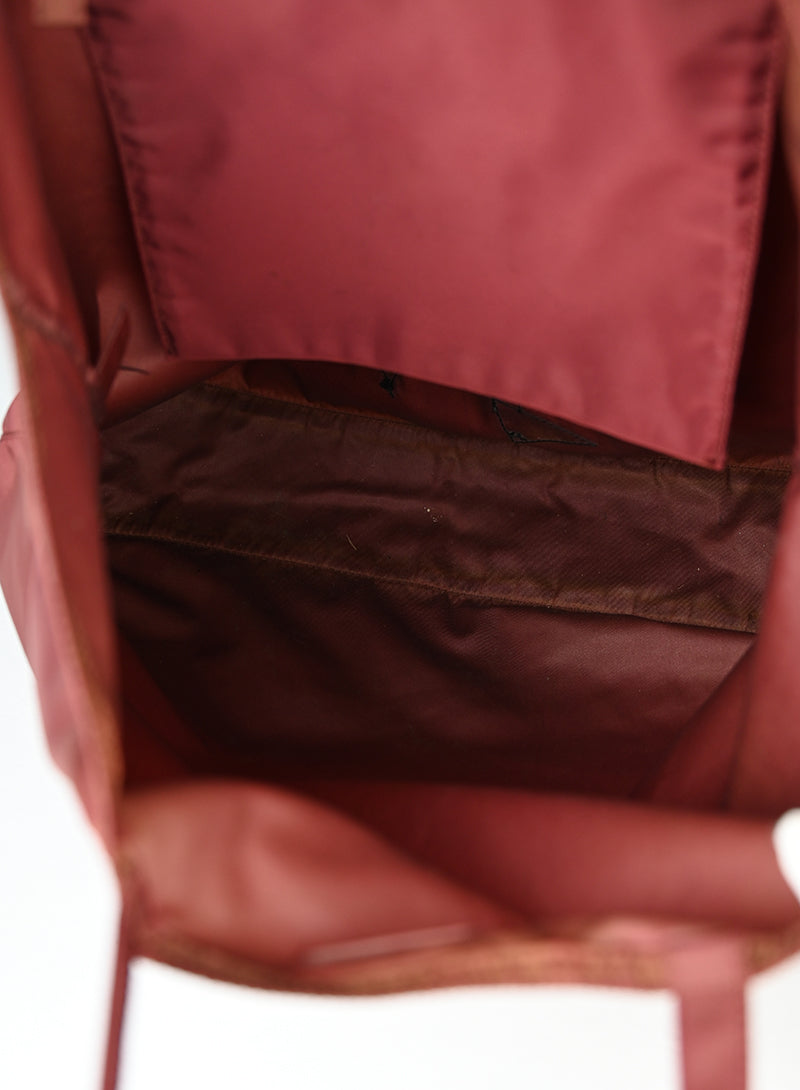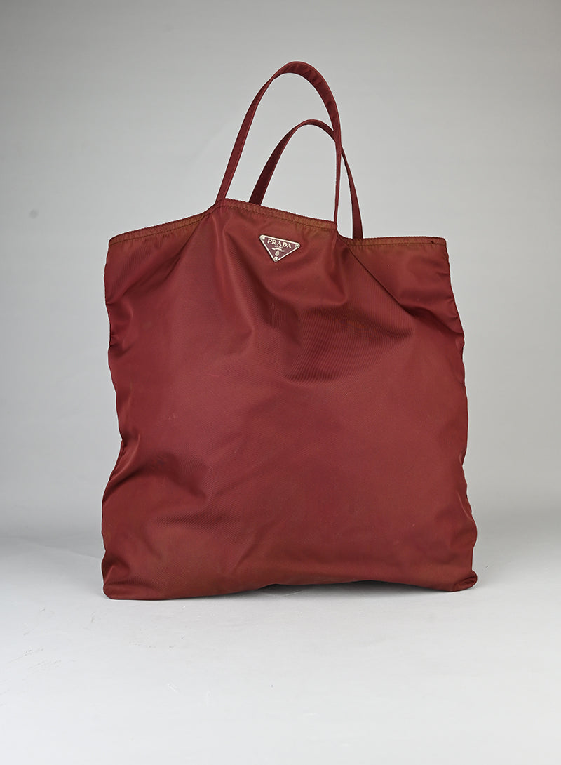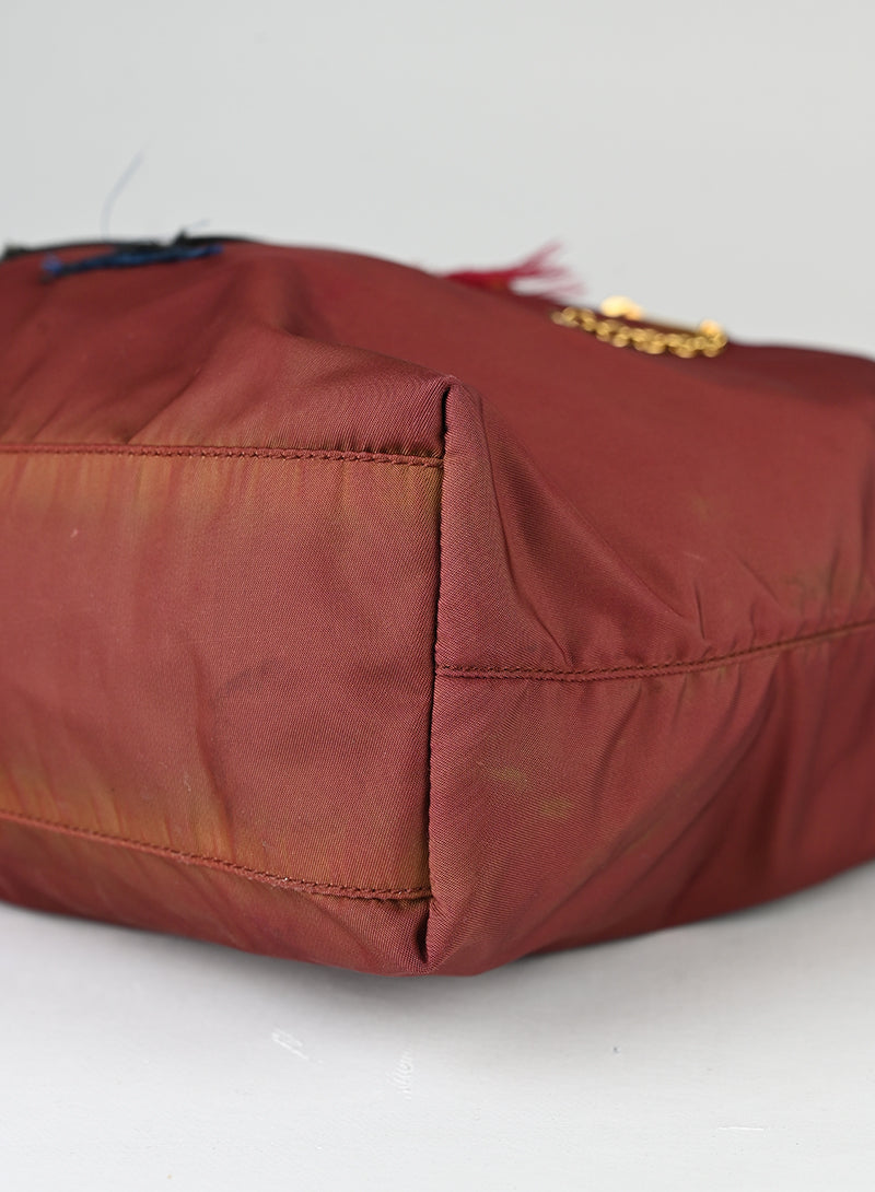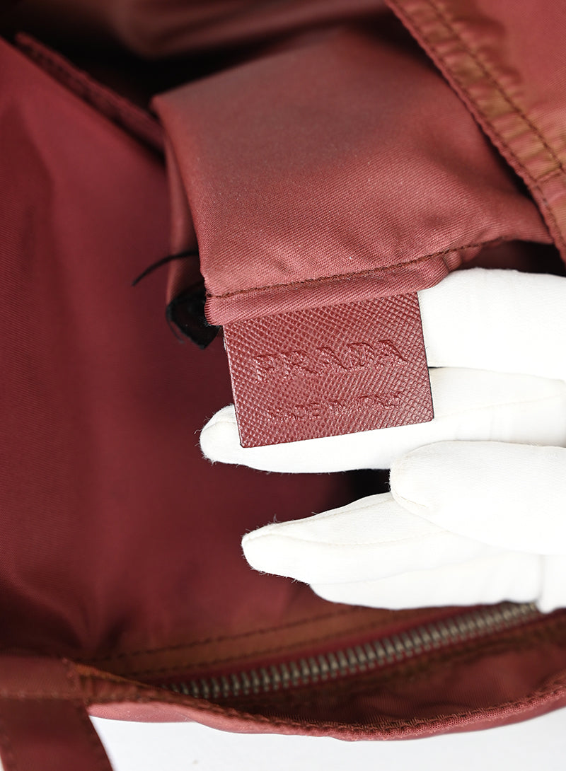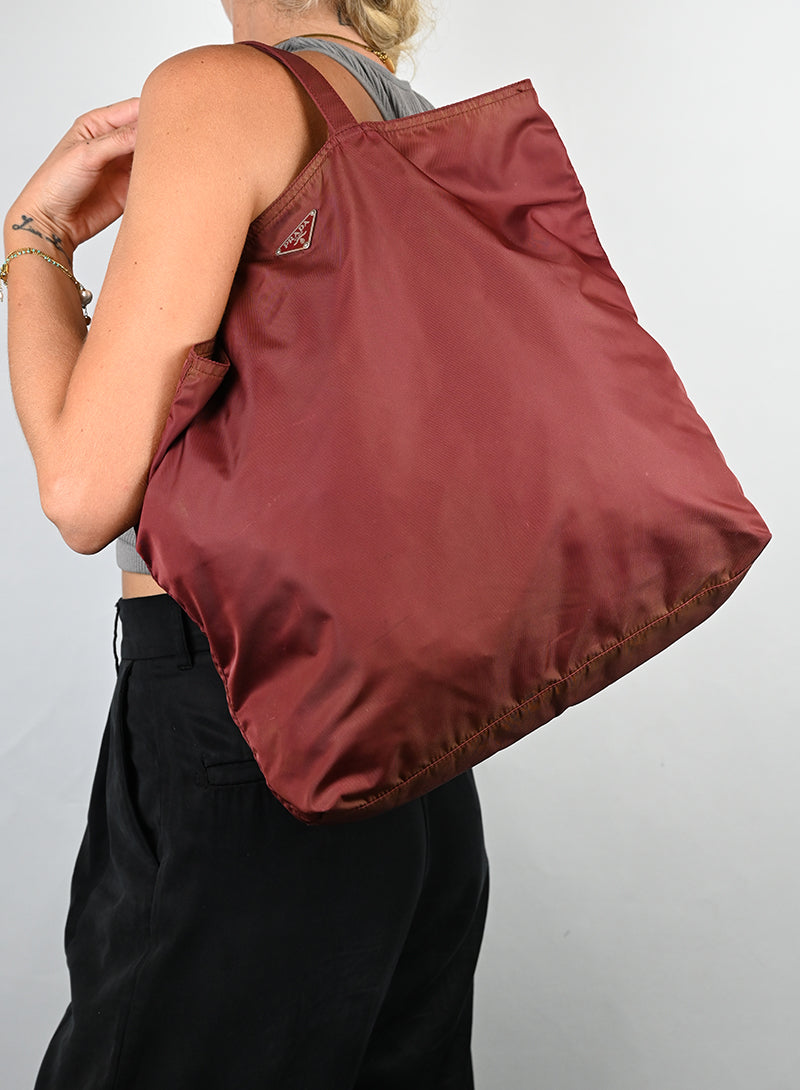 La tote bag Prada in nylon bordeaux unisce eleganza e funzionalità con un ricamo originale a motivo robot e il classico logo triangolare in metallo. Dotata di due manici corti, presenta un interno sfoderato con un unico scompartimento e una taschina con zip, ideale per mantenere ordine con stile discreto e raffinato. Un accessorio sofisticato per chi cerca un tocco distintivo nella praticità quotidiana.