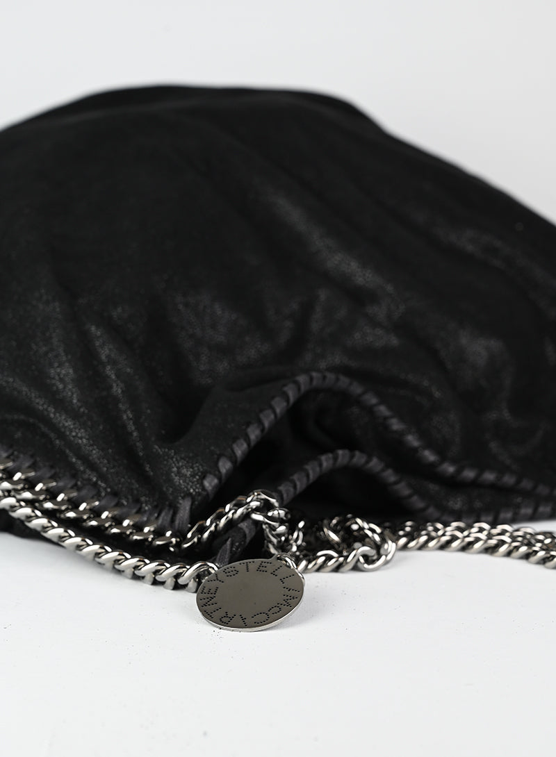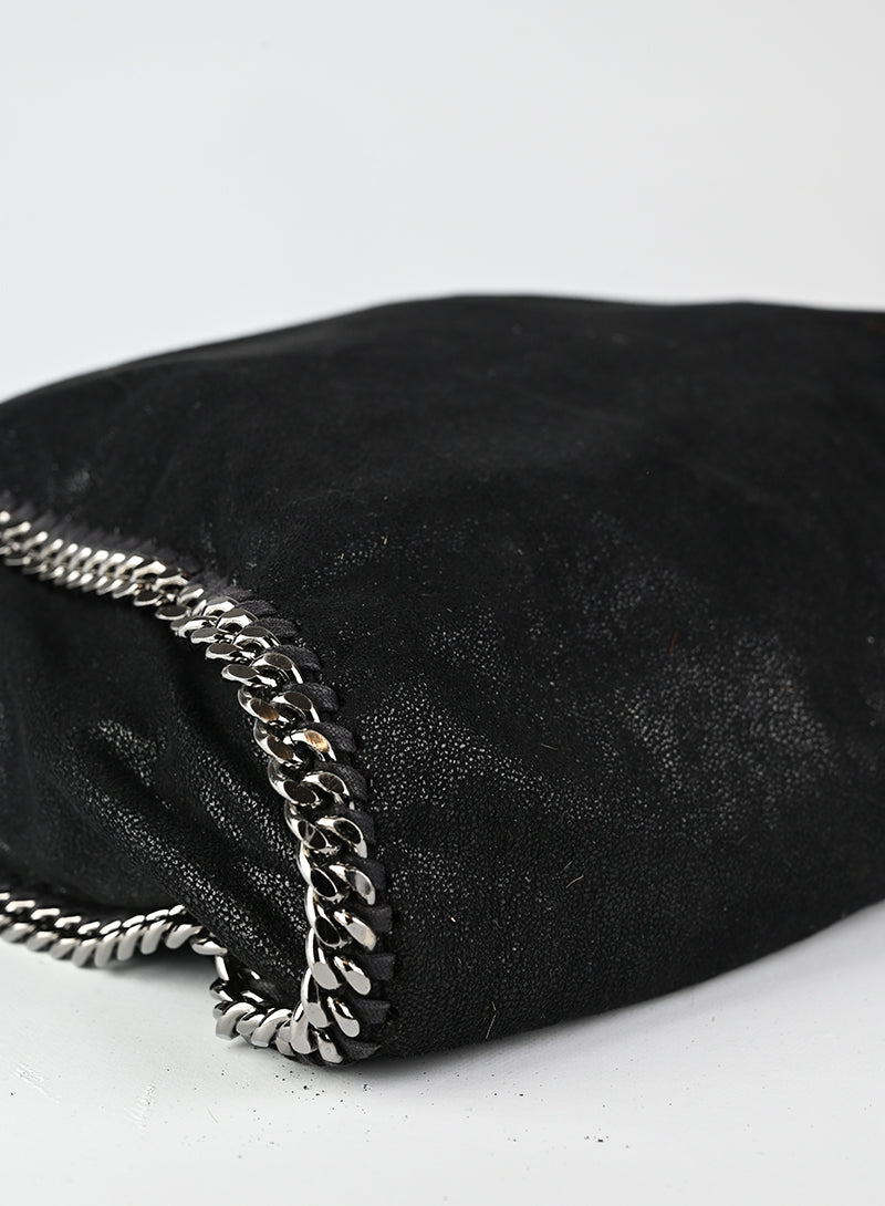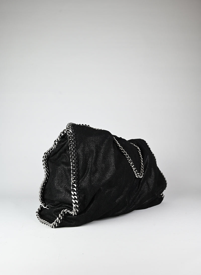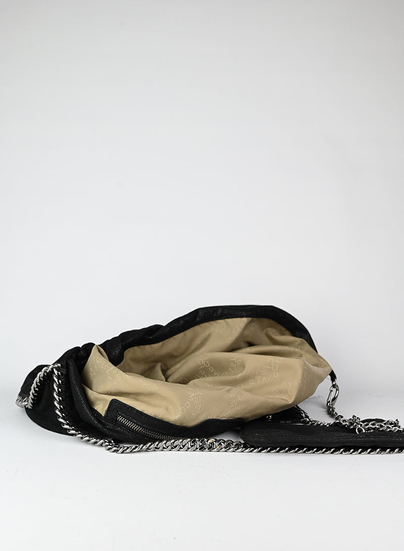 Questa borsa Falabella nera di Stella McCartney è un capolavoro di stile e si distingue per i suoi dettagli unici. I profili e manici in catena di metallo aggiungono una nota di lusso, mentre la medaglietta tonda in metallo la rende ancora più esclusiva. L'interno in tessuto beige e la pochette nera removibile la rendono versatile e funzionale.