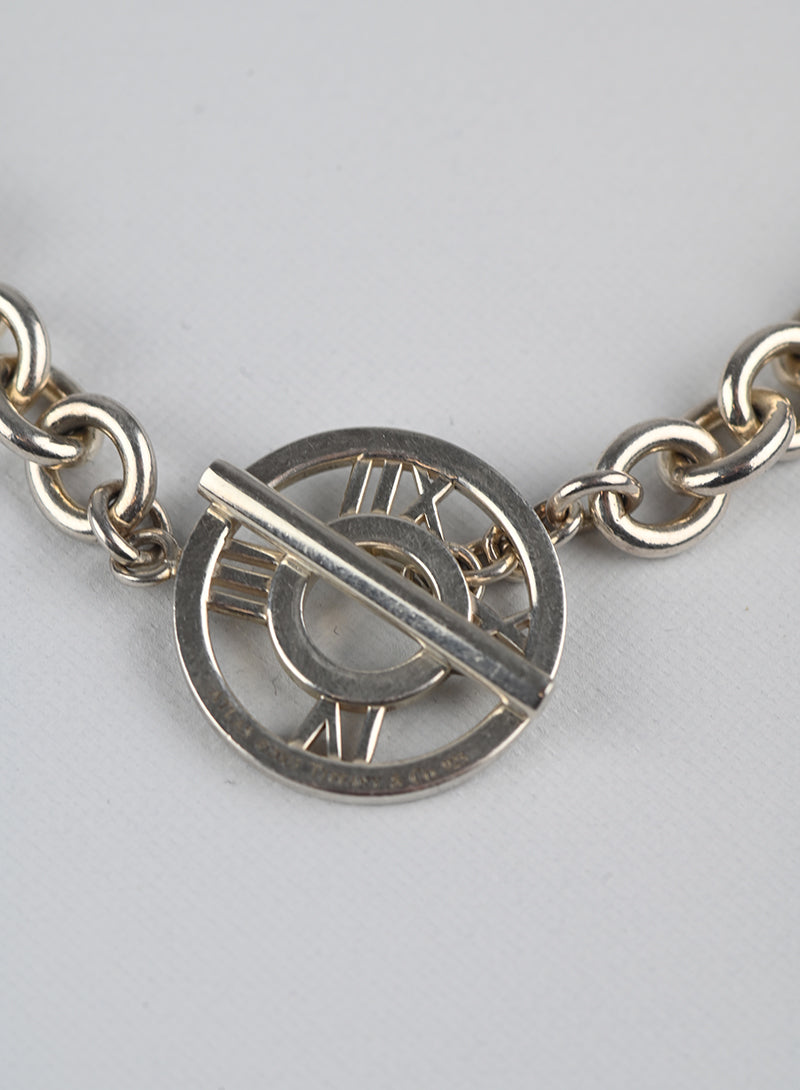 Questa collana Tiffany & Co. è un'incarnazione di eleganza. Realizzata in argento, presenta una catena delicata con una chiusura a ciondolo Atlas che rappresenta i numeri romani. Indossa questa collana per aggiungere un tocco di classe e raffinatezza al tuo look.
