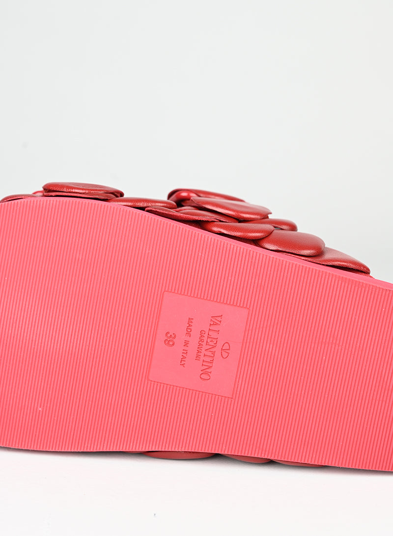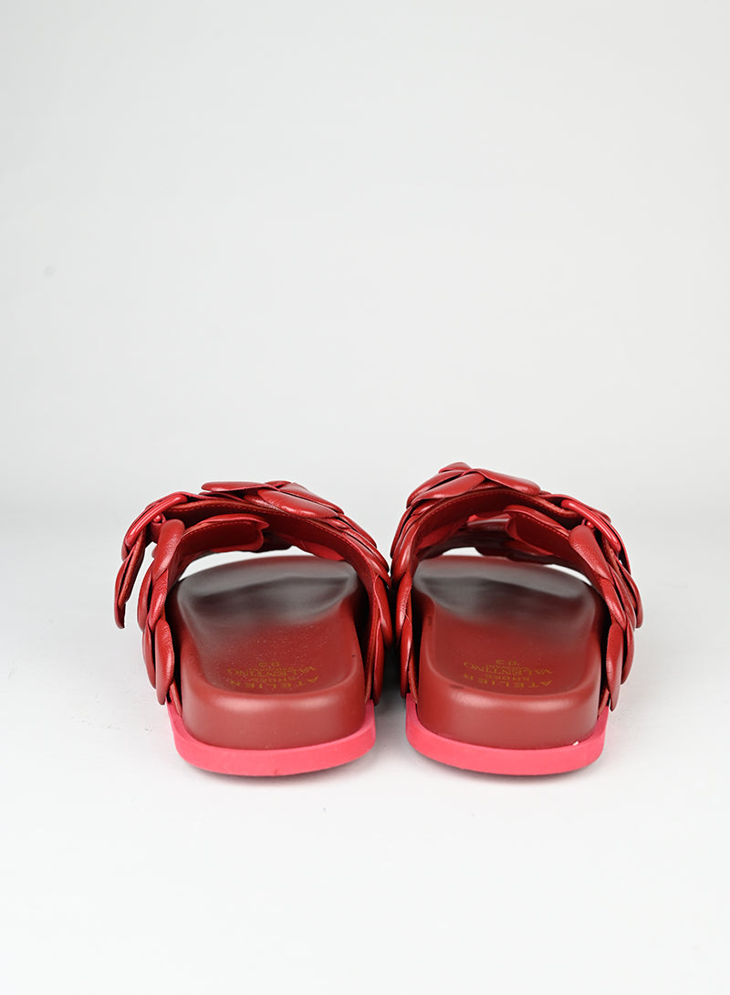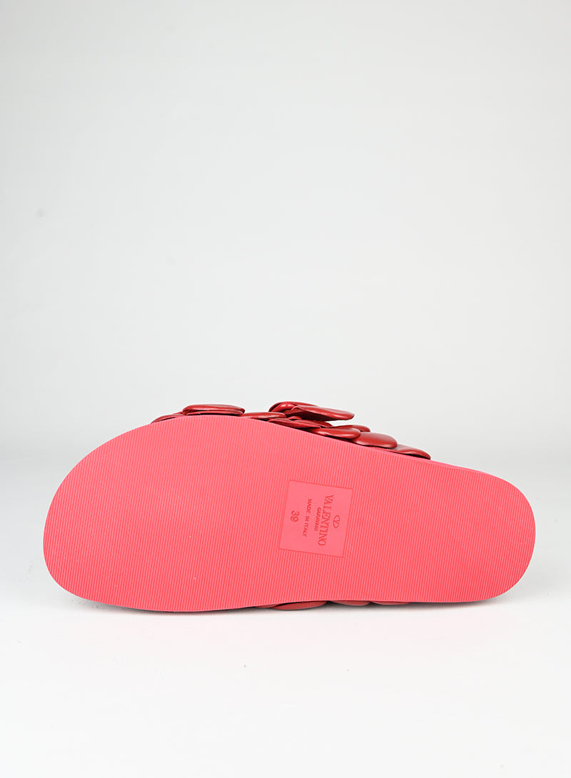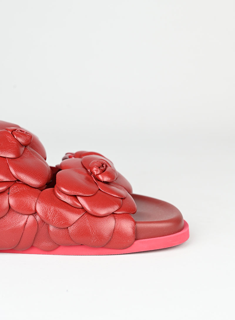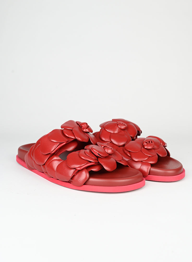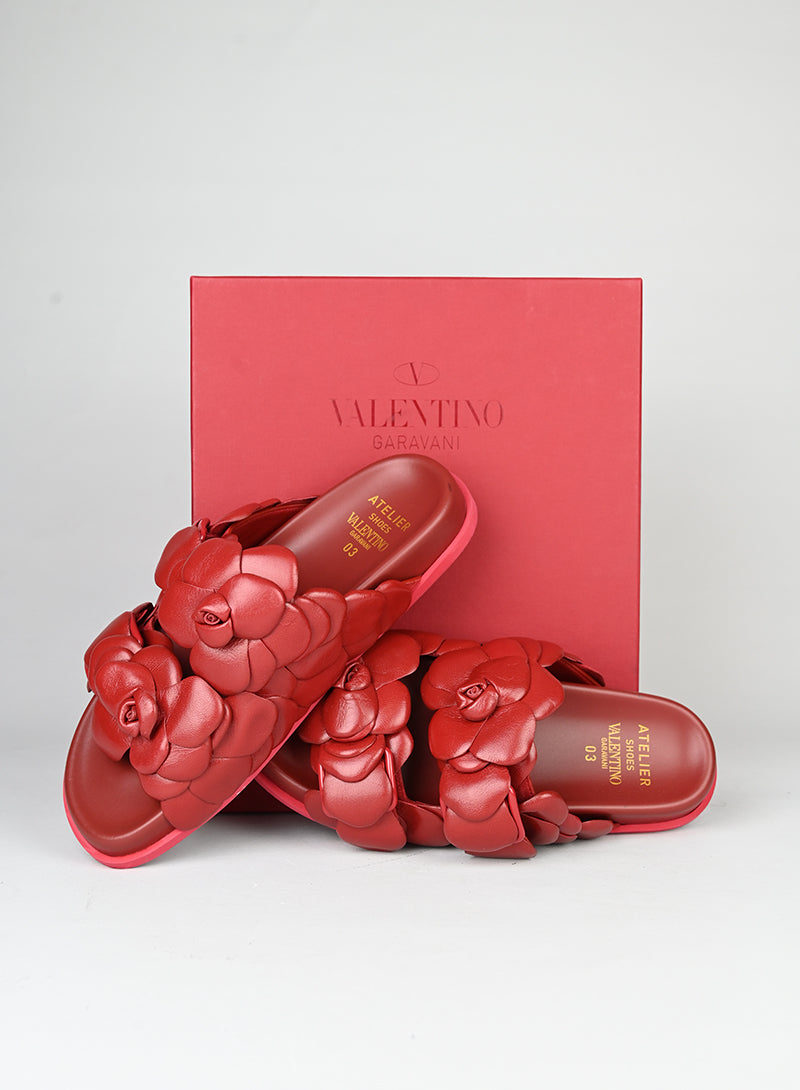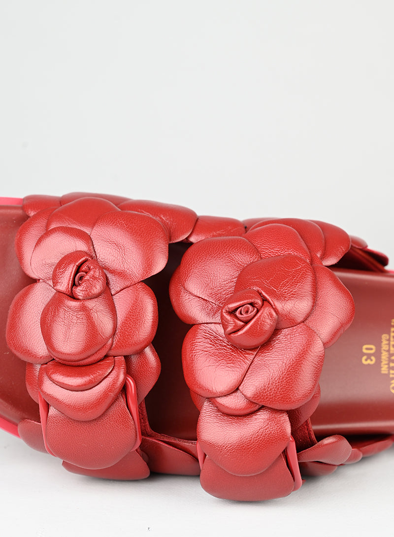 Eleganti sandali Valentino in pelle bordeaux, caratterizzati da due fasce arricchite da raffinate applicazioni a forma di rosa. La suola in gomma rossa garantisce comfort e durata, mentre il design a ciabatta offre una calzata facile e sofisticata. Ideali per aggiungere un tocco di classe a qualsiasi look estivo.