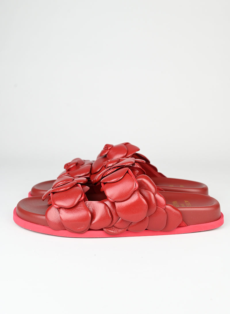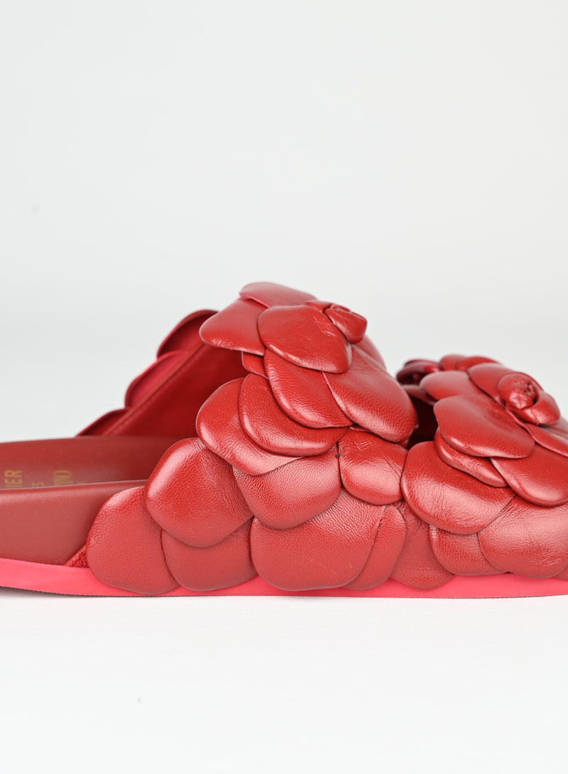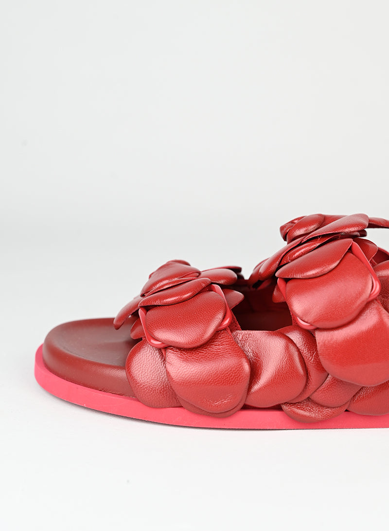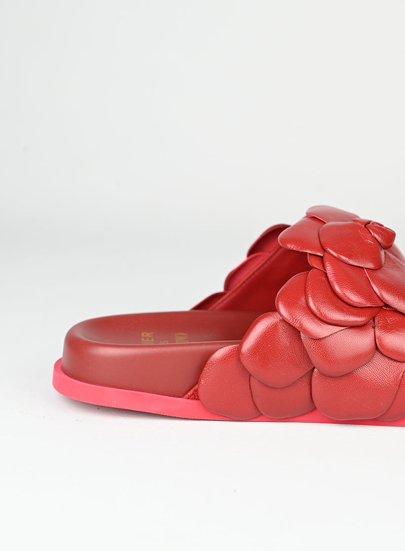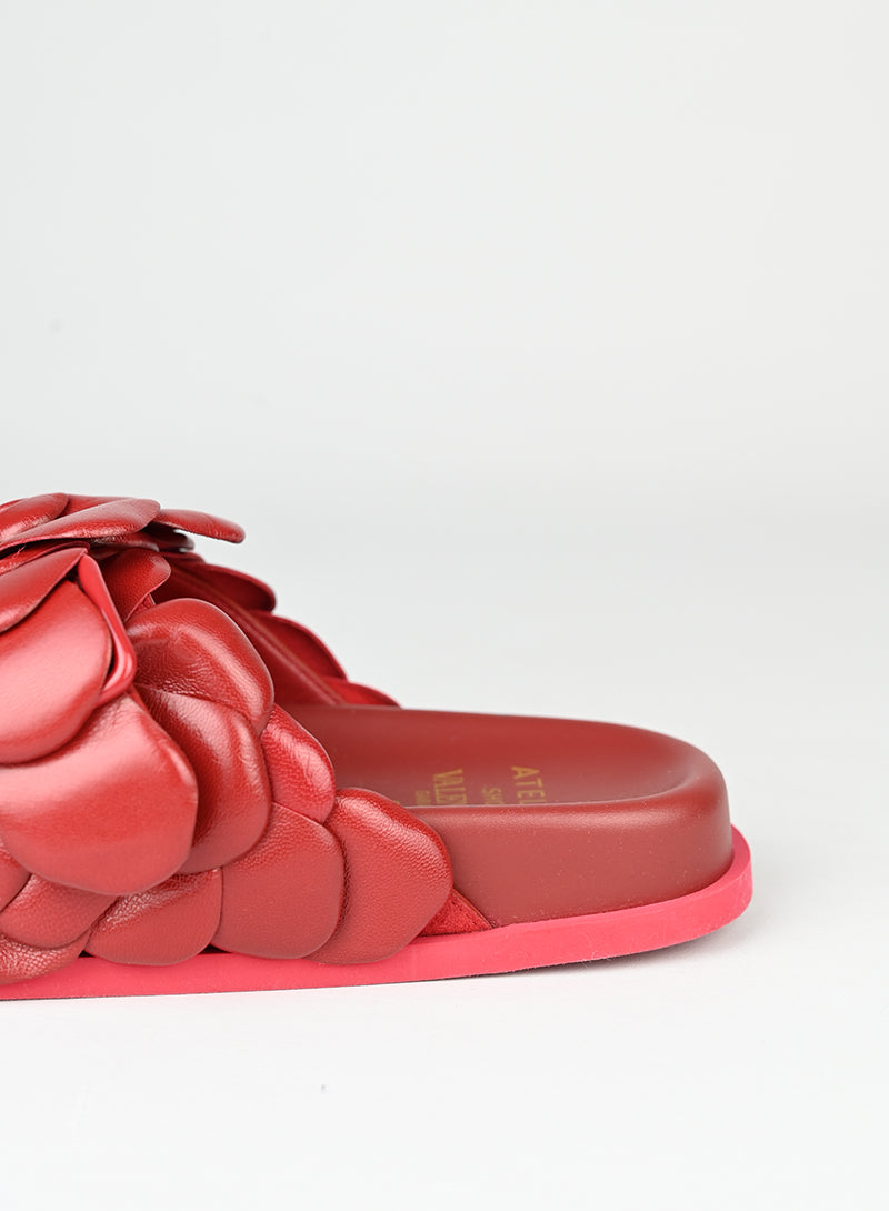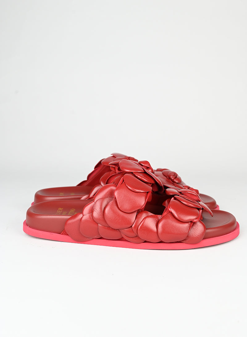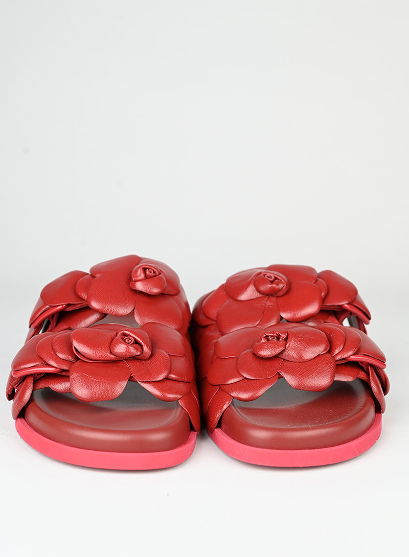 Eleganti sandali Valentino in pelle bordeaux, caratterizzati da due fasce arricchite da raffinate applicazioni a forma di rosa. La suola in gomma rossa garantisce comfort e durata, mentre il design a ciabatta offre una calzata facile e sofisticata. Ideali per aggiungere un tocco di classe a qualsiasi look estivo.