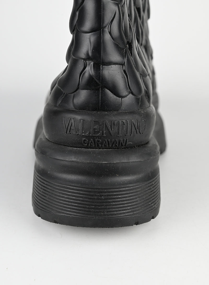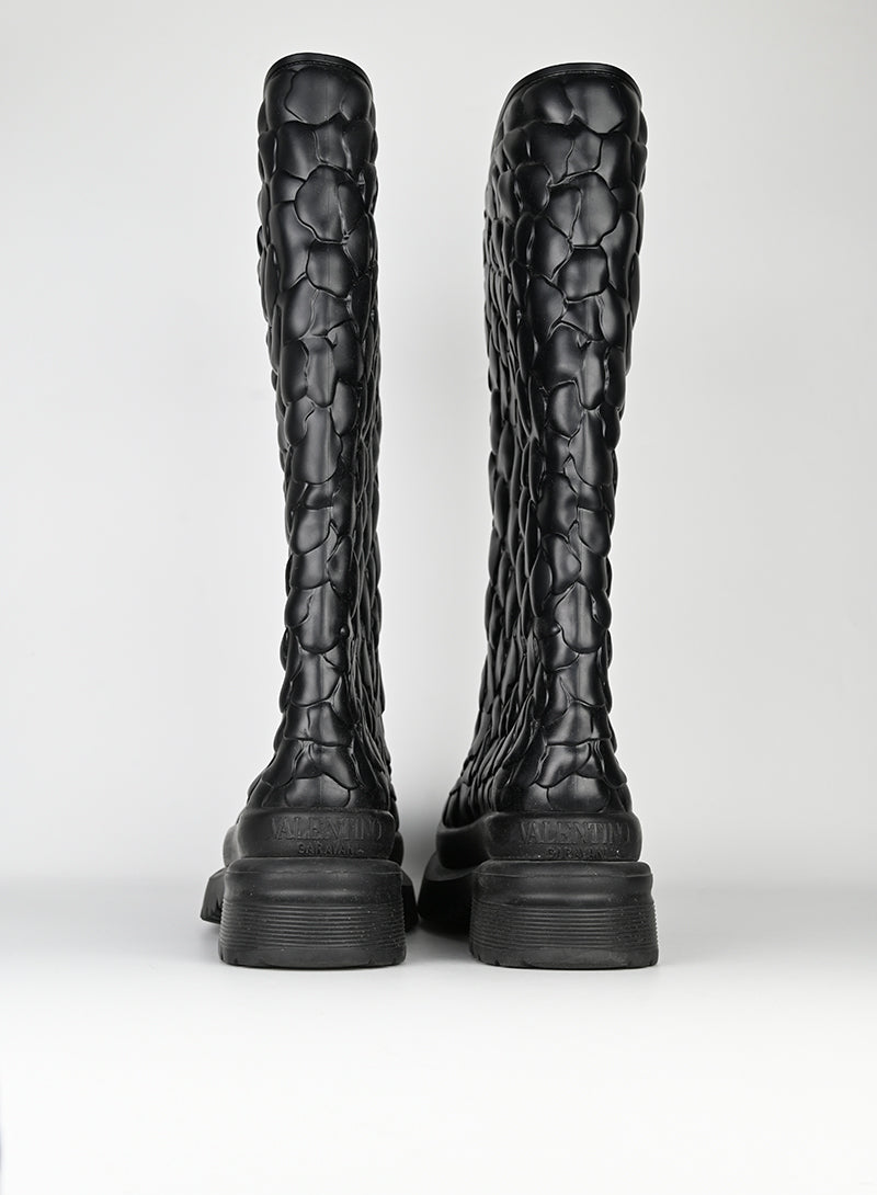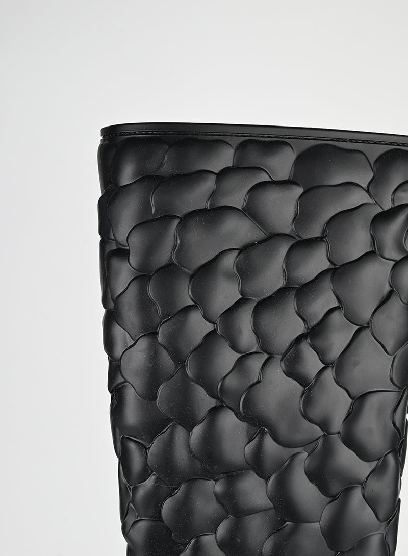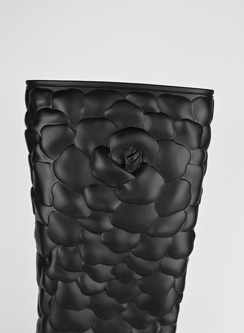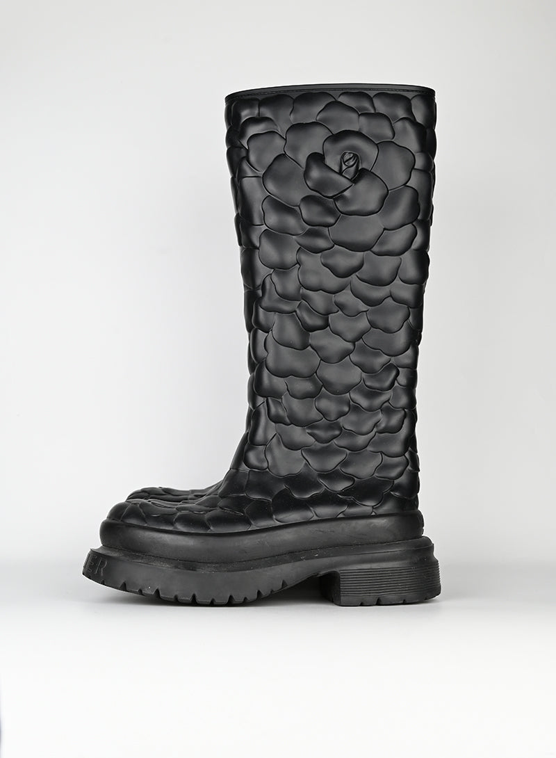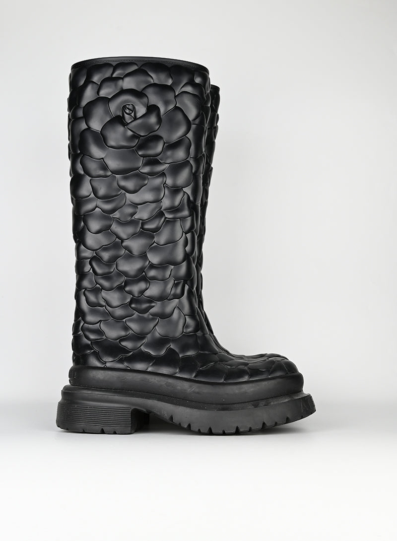 Esalta i tuoi look con gli eleganti Stivali in gomma Rose edition Valentino. Realizzati in nero lucido, con para alta e tacchetto, questi stivali uniscono funzionalità e stile. Il design unico con petali su tutta la superficie aggiunge un tocco di femminilità e glamour al tuo outfit.