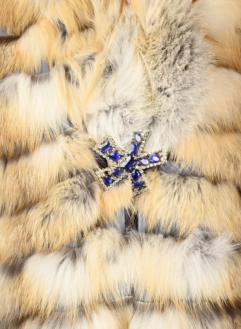 Who's Who gilet in volpe beige screziata, un capolavoro di eleganza vintage. Caratterizzato da due pratiche tasche, collo rever raffinato e chiusura con ganci a scomparsa per un'estetica impeccabile. Il primo gancio è ornato da una spilla fiore con pietre viola e bianche brillanti che cattura la luce. La fodera interna in viola aggiunge un tocco di lusso nascosto. Un pezzo sofisticato che eleva qualsiasi guardaroba con stile senza tempo.